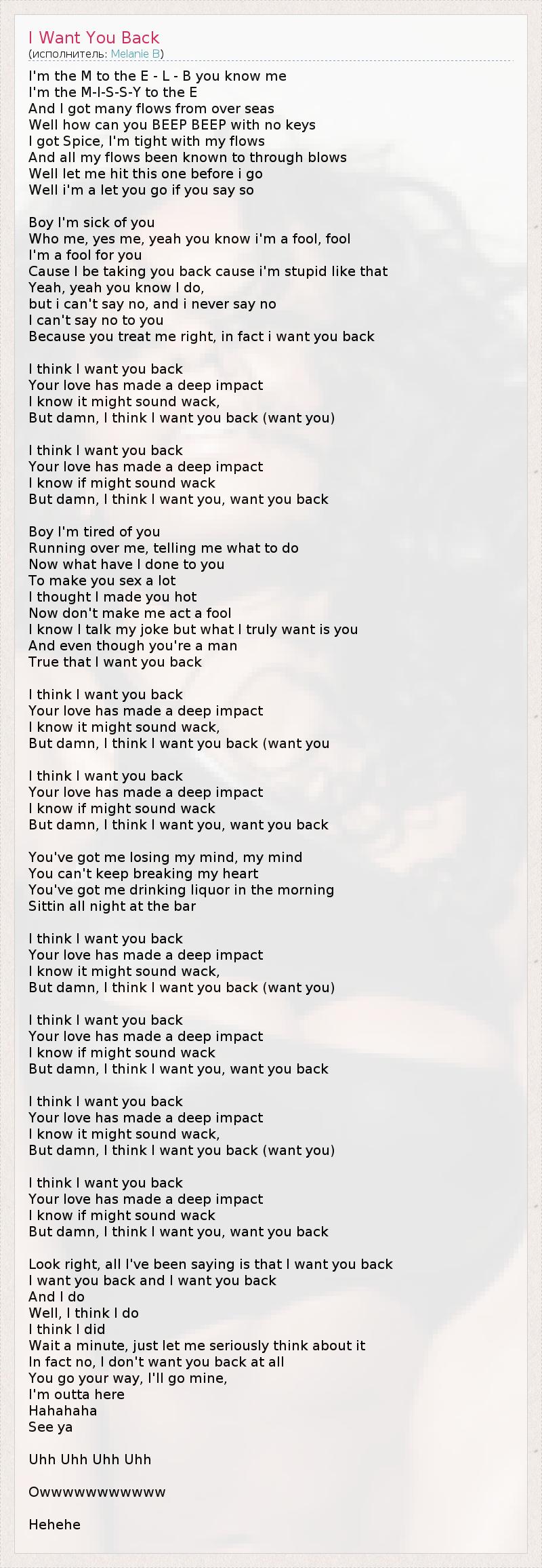 I'm the M to the E - L - B you know me I'm the M-I-S-S-Y to the E And I got many flows from over seas Well how can you BEEP BEEP with no keys I got Spice, I'm tight with my flows And all my flows been known to through blows Well let me hit this one before i go Well i'm a let you go if you say so Boy I'm sick of you Who me, yes me, yeah you know i'm a fool, fool I'm a fool for you Cause I be taking you back cause i'm stupid like that Yeah, yeah you know I do, but i can't say no, and i never say no I can't say no to you Because you treat me right, in fact i want you back I think I want you back Your love has made a deep impact I know it might sound wack, But damn, I think I want you back (want you) I think I want you back Your love has made a deep impact I know if might sound wack But damn, I think I want you, want you back Boy I'm tired of you Running over me, telling me what to do Now what have I done to you To make you sex a lot I thought I made you hot Now don't make me act a fool I know I talk my joke but what I truly want is you And even though you're a man True that I want you back I think I want you back Your love has made a deep impact I know it might sound wack, But damn, I think I want you back (want you I think I want you back Your love has made a deep impact I know if might sound wack But damn, I think I want you, want you back You've got me losing my mind, my mind You can't keep breaking my heart You've got me drinking liquor in the morning Sittin all night at the bar I think I want you back Your love has made a deep impact I know it might sound wack, But damn, I think I want you back (want you) I think I want you back Your love has made a deep impact I know if might sound wack But damn, I think I want you, want you back I think I want you back Your love has made a deep impact I know it might sound wack, But damn, I think I want you back (want you) I think I want you back Your love has made a deep impact I know if might sound wack But damn, I think I want you, want you back Look right, all I've been saying is that I want you back I want you back and I want you back And I do Well, I think I do I think I did Wait a minute, just let me seriously think about it In fact no, I don't want you back at all You go your way, I'll go mine, I'm outta here Hahahaha See ya Uhh Uhh Uhh Uhh Owwwwwwwwwww Hehehe