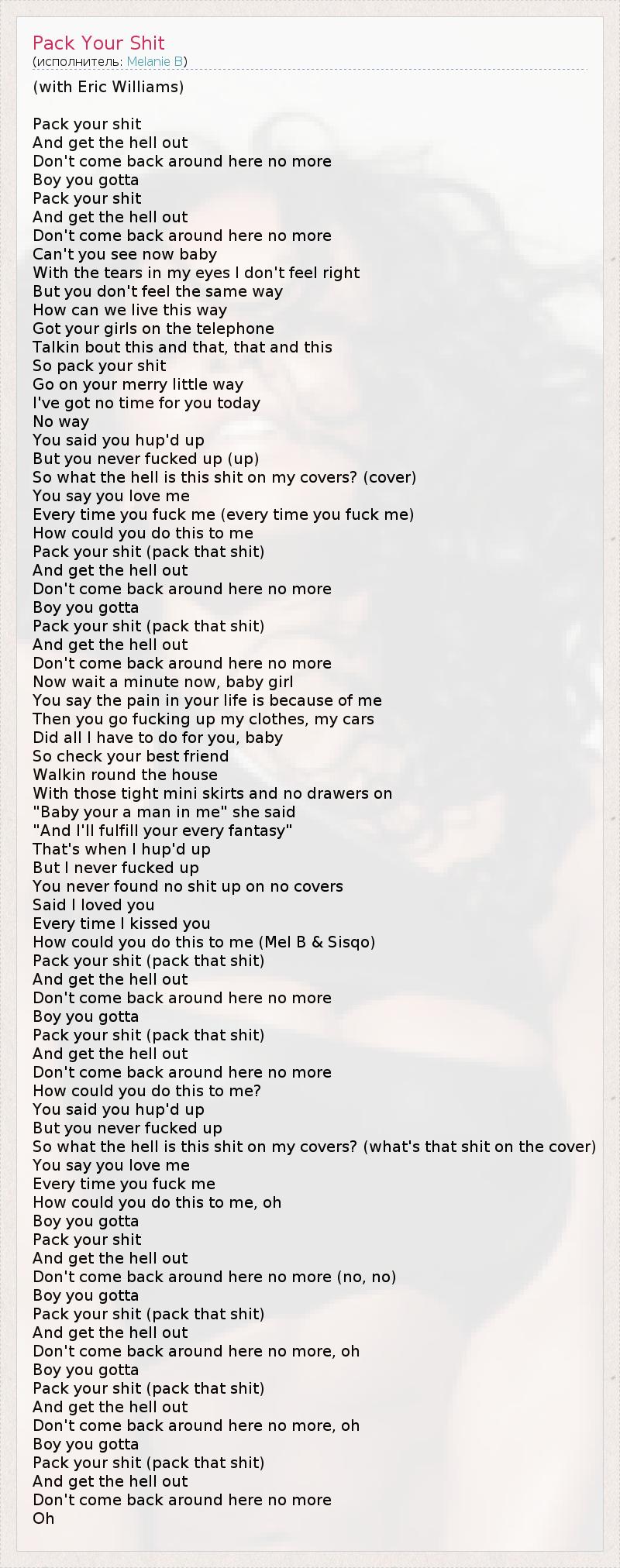 (with Eric Williams) Pack your shit And get the hell out Don't come back around here no more Boy you gotta Pack your shit And get the hell out Don't come back around here no more Can't you see now baby With the tears in my eyes I don't feel right But you don't feel the same way How can we live this way Got your girls on the telephone Talkin bout this and that, that and this So pack your shit Go on your merry little way I've got no time for you today No way You said you hup'd up But you never fucked up (up) So what the hell is this shit on my covers? (cover) You say you love me Every time you fuck me (every time you fuck me) How could you do this to me Pack your shit (pack that shit) And get the hell out Don't come back around here no more Boy you gotta Pack your shit (pack that shit) And get the hell out Don't come back around here no more Now wait a minute now, baby girl You say the pain in your life is because of me Then you go fucking up my clothes, my cars Did all I have to do for you, baby So check your best friend Walkin round the house With those tight mini skirts and no drawers on "Baby your a man in me" she said "And I'll fulfill your every fantasy" That's when I hup'd up But I never fucked up You never found no shit up on no covers Said I loved you Every time I kissed you How could you do this to me (Mel B & Sisqo) Pack your shit (pack that shit) And get the hell out Don't come back around here no more Boy you gotta Pack your shit (pack that shit) And get the hell out Don't come back around here no more How could you do this to me? You said you hup'd up But you never fucked up So what the hell is this shit on my covers? (what's that shit on the cover) You say you love me Every time you fuck me How could you do this to me, oh Boy you gotta Pack your shit And get the hell out Don't come back around here no more (no, no) Boy you gotta Pack your shit (pack that shit) And get the hell out Don't come back around here no more, oh Boy you gotta Pack your shit (pack that shit) And get the hell out Don't come back around here no more, oh Boy you gotta Pack your shit (pack that shit) And get the hell out Don't come back around here no more Oh