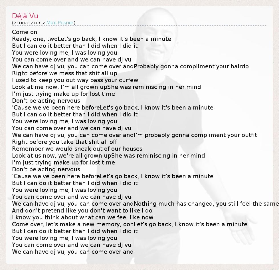 Come on Ready, one, twoLet's go back, I know it's been a minute But I can do it better than I did when I did it You were loving me, I was loving you You can come over and we can have dj vu We can have dj vu, you can come over andProbably gonna compliment your hairdo Right before we mess that shit all up I used to keep you out way pass your curfew Look at me now, I'm all grown upShe was reminiscing in her mind I'm just trying make up for lost time Don't be acting nervous 'Cause we've been here beforeLet's go back, I know it's been a minute But I can do it better than I did when I did it You were loving me, I was loving you You can come over and we can have dj vu We can have dj vu, you can come over andI'm probably gonna compliment your outfit Right before you take that shit all off Remember we would sneak out of our houses Look at us now, we're all grown upShe was reminiscing in her mind I'm just trying make up for lost time Don't be acting nervous 'Cause we've been here beforeLet's go back, I know it's been a minute But I can do it better than I did when I did it You were loving me, I was loving you You can come over and we can have dj vu We can have dj vu, you can come over andNothing much has changed, you still feel the same And don't pretend like you don't want to like I do I know you think about what can we feel like now Come over, let's make a new memory, oohLet's go back, I know it's been a minute But I can do it better than I did when I did it You were loving me, I was loving you You can come over and we can have dj vu We can have dj vu, you can come over and