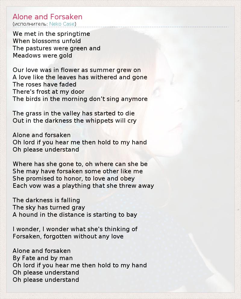 We met in the springtime When blossoms unfold The pastures were green and Meadows were gold Our love was in flower as summer grew on A love like the leaves has withered and gone The roses have faded There's frost at my door The birds in the morning don't sing anymore The grass in the valley has started to die Out in the darkness the whippets will cry Alone and forsaken Oh lord if you hear me then hold to my hand Oh please understand Where has she gone to, oh where can she be She may have forsaken some other like me She promised to honor, to love and obey Each vow was a plaything that she threw away The darkness is falling The sky has turned gray A hound in the distance is starting to bay I wonder, I wonder what she's thinking of Forsaken, forgotten without any love Alone and forsaken By Fate and by man Oh lord if you hear me then hold to my hand Oh please understand Oh please understand