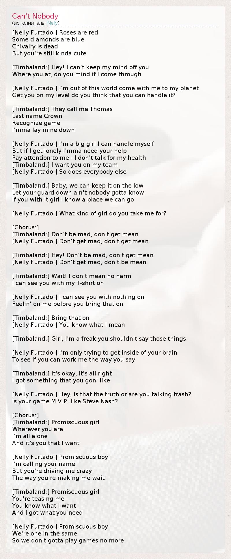 [Nelly Furtado:] Roses are red Some diamonds are blue Chivalry is dead But you're still kinda cute [Timbaland:] Hey! I can't keep my mind off you Where you at, do you mind if I come through [Nelly Furtado:] I'm out of this world come with me to my planet Get you on my level do you think that you can handle it? [Timbaland:] They call me Thomas Last name Crown Recognize game I'mma lay mine down [Nelly Furtado:] I'm a big girl I can handle myself But if I get lonely I'mma need your help Pay attention to me - I don't talk for my health [Timbaland:] I want you on my team [Nelly Furtado:] So does everybody else [Timbaland:] Baby, we can keep it on the low Let your guard down ain't nobody gotta know If you with it girl I know a place we can go [Nelly Furtado:] What kind of girl do you take me for? [Chorus:] [Timbaland:] Don't be mad, don't get mean [Nelly Furtado:] Don't get mad, don't get mean [Timbaland:] Hey! Don't be mad, don't get mean [Nelly Furtado:] Don't get mad, don't be mean [Timbaland:] Wait! I don't mean no harm I can see you with my T-shirt on [Nelly Furtado:] I can see you with nothing on Feelin' on me before you bring that on [Timbaland:] Bring that on [Nelly Furtado:] You know what I mean [Timbaland:] Girl, I'm a freak you shouldn't say those things [Nelly Furtado:] I'm only trying to get inside of your brain To see if you can work me the way you say [Timbaland:] It's okay, it's all right I got something that you gon' like [Nelly Furtado:] Hey, is that the truth or are you talking trash? Is your game M.V.P. like Steve Nash? [Chorus:] [Timbaland:] Promiscuous girl Wherever you are I'm all alone And it's you that I want [Nelly Furtado:] Promiscuous boy I'm calling your name But you're driving me crazy The way you're making me wait [Timbaland:] Promiscuous girl You're teasing me You know what I want And I got what you need [Nelly Furtado:] Promiscuous boy We're one in the same So we don't gotta play games no more