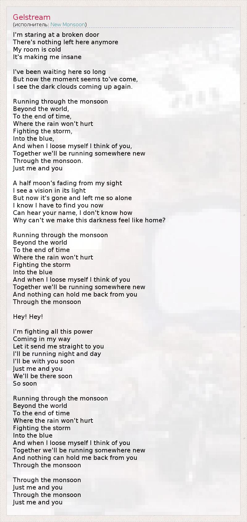 Я пристально смотрю на разбитую дверь, Больше ничего не осталось здесь. Моя комната холодная, Это сводит меня с ума... Я ждал здесь так долго, Но сейчас, кажется, время пришло. Я вижу приближающиеся снова тучи. Пробегая сквозь муссон, Позади мира Да конца времен, Когда дожди перестанут ранить, Борясь со штормом, В небе И когда я теряю себя, я думаю о тебе. Вместе мы побежим куда-нибудь Через муссон, Только я и ты. Месяц тает с моей стороны, Я вижу твой образ в его свете. Но сейчас он исчез и оставил меня одного... Я знаю, я должен найти тебя сейчас, Слышу твое имя, не знаю каким образом, Почему мы не можем в темноте чувствовать себя как дома? Пробегая сквозь муссон, Позади мира Да конца времен, Когда дожди перестанут ранить, Борясь со штормом, В небе И когда я теряю себя, я думаю о тебе. Вместе мы побежим куда-нибудь Через муссон, Только я и ты. Эй! Эй! Я борюсь со всеми этими силами, Появляющимися на моем пути. Если бы они направили меня прямо к тебе, Я бы бежал день и ночь! Я буду с тобой скоро, Только ты и я. Мы будем там скоро, Так скоро... Пробегая сквозь муссон, Позади мира Да конца времен, Когда дожди перестанут ранить, Борясь со штормом, В небе И когда я теряю себя, я думаю о тебе. Вместе мы побежим куда-нибудь Через муссон, Только я и ты. Через муссон, Только я и ты. Через муссон, Только я и ты.
