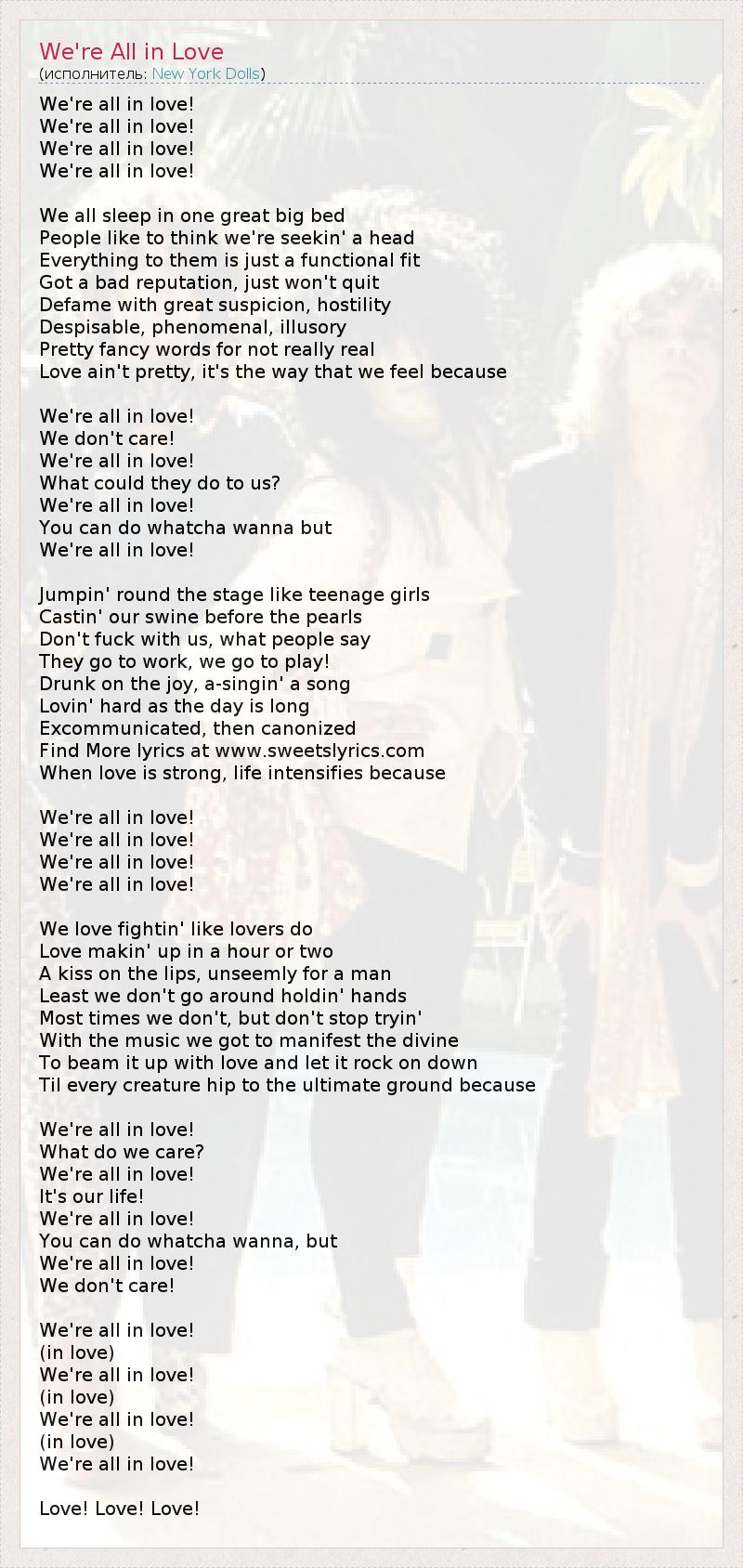 Мы все в любви Мы все в любви Мы все в любви Мы все в любви Мы все спят в одной большой большой кроватью Людям нравится думать, что мы seekin "головы Все для них является только функциональные подходит Есть плохая репутация, но только не уйдет в отставку Клевета с большим подозрением, враждебностью Презренный, феноменальный, иллюзорный Довольно слов для фантазии не совсем реальной Любовь не очень, это так, что мы чувствуем, потому что Мы все в любви (Мы не волнует) Мы все в любви (Что они могли сделать с нами?) Мы все в любви (Вы можете делать что хотите, но) Мы все в любви Прыжки по сцене, как девочки-подростки Кастинг наших свиней перед жемчугом "Не ебать с нами", что люди говорят Они ходят на работу, мы идем играть Пьяный на радость,-Поющие песни Любить сложно, как день долог Отлучен от церкви, то канонизирован Когда любовь сильна, потому что жизнь усиливается Мы все в любви Мы все в любви Мы все в любви Мы все в любви Мы любим борьбы, как любителей делать Любовь решений в час или два Поцелуй в губы неприлично человек "Наименее мы не ходить, держась за руки В большинстве случаев мы не но не прекратить попытки С Музыка, которую мы должны проявлять божественную Чтобы передать его с любовью и Let It Rock вниз 'Til всякой твари бедра до конечной земле, потому что Мы все в любви (Что нам?) Мы все в любви (Это наша жизнь) Мы все в любви (Вы можете делать что хотите, но) Мы все в любви (Мы не волнует) Мы все в любви (В любви) Мы все в любви (В любви) Мы все в любви (В любви) Мы все в любви Любовь, любовь, любовь, любовь