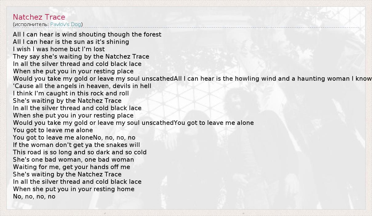 All I can hear is wind shouting though the forest All I can hear is the sun as it's shining I wish I was home but I'm lost They say she's waiting by the Natchez Trace In all the silver thread and cold black lace When she put you in your resting place Would you take my gold or leave my soul unscathedAll I can hear is the howling wind and a haunting woman I know 'Cause all the angels in heaven, devils in hell I think I'm caught in this rock and roll She's waiting by the Natchez Trace In all the silver thread and cold black lace When she put you in your resting place Would you take my gold or leave my soul unscathedYou got to leave me alone You got to leave me alone You got to leave me aloneNo, no, no, no If the woman don't get ya the snakes will This road is so long and so dark and so cold She's one bad woman, one bad woman Waiting for me, get your hands off me She's waiting by the Natchez Trace In all the silver thread and cold black lace When she put you in your resting home No, no, no, no
