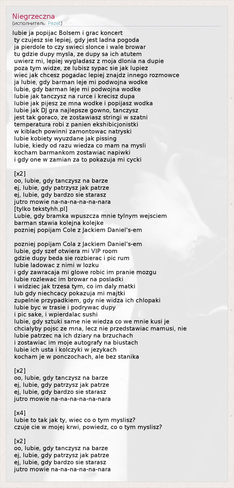 lubie ja popijac Bolsem i grac koncert ty czujesz sie lepiej, gdy jest ladna pogoda ja pierdole to czy swieci slonce i wale browar tu gdzie dupy mysla, ze dupy sa ich atutem uwierz mi, lepiej wygladasz z moja dlonia na dupie poza tym widze, ze lubisz sypac sie jak lupiez wiec jak chcesz pogadac lepiej znajdz innego rozmowce ja lubie, gdy barman leje mi podwojna wodke lubie, gdy barman leje mi podwojna wodke lubie jak tanczysz na rurce i krecisz dupa lubie jak pijesz ze mna wodke i popijasz wodka lubie jak DJ gra najlepsze gowno, tanczysz jest tak goraco, ze zostawiasz stringi w szatni temperatura robi z panien ekshibicjonistki w kiblach powinni zamontowac natryski lubie kobiety wyuzdane jak pissing lubie, kiedy od razu wiedza co mam na mysli kocham barmankom zostawiac napiwki i gdy one w zamian za to pokazuja mi cycki [x2] oo, lubie, gdy tanczysz na barze ej, lubie, gdy patrzysz jak patrze ej, lubie, gdy bardzo sie starasz jutro mowie na-na-na-na-na-nara [tylko tekstyhh.pl] Lubie, gdy bramka wpuszcza mnie tylnym wejsciem barman stawia kolejna kolejke pozniej popijam Cole z Jackiem Daniel's-em pozniej popijam Cola z Jackiem Daniel's-em lubie, gdy szef otwiera mi VIP room gdzie dupy beda sie rozbierac i pic rum lubie ladowac z nimi w lozku i gdy zawracaja mi glowe robic im pranie mozgu lubie rozlewac im browar na posladki i widziec jak trzesa tym, co im daly matki lub gdy niechcacy pokazuja mi majtki zupelnie przypadkiem, gdy nie widza ich chlopaki lubie byc w trasie i podrywac dupy i pic sake, i wpierdalac sushi lubie, gdy sztuki same nie wiedza co we mnie kusi je chcialyby pojsc ze mna, lecz nie przedstawiac mamusi, nie lubie patrzec na ich dziary na brzuchach i zostawiac im moje autografy na biustach lubie ich usta i kolczyki w jezykach kocham je w ponczochach, ale bez stanika [x2] oo, lubie, gdy tanczysz na barze ej, lubie, gdy patrzysz jak patrze ej, lubie, gdy bardzo sie starasz jutro mowie na-na-na-na-na-nara [x4] lubie to tak jak ty, wiec co o tym myslisz? czuje cie w mojej krwi, powiedz, co o tym myslisz? [x2] oo, lubie, gdy tanczysz na barze ej, lubie, gdy patrzysz jak patrze ej, lubie, gdy bardzo sie starasz jutro mowie na-na-na-na-na-nara
