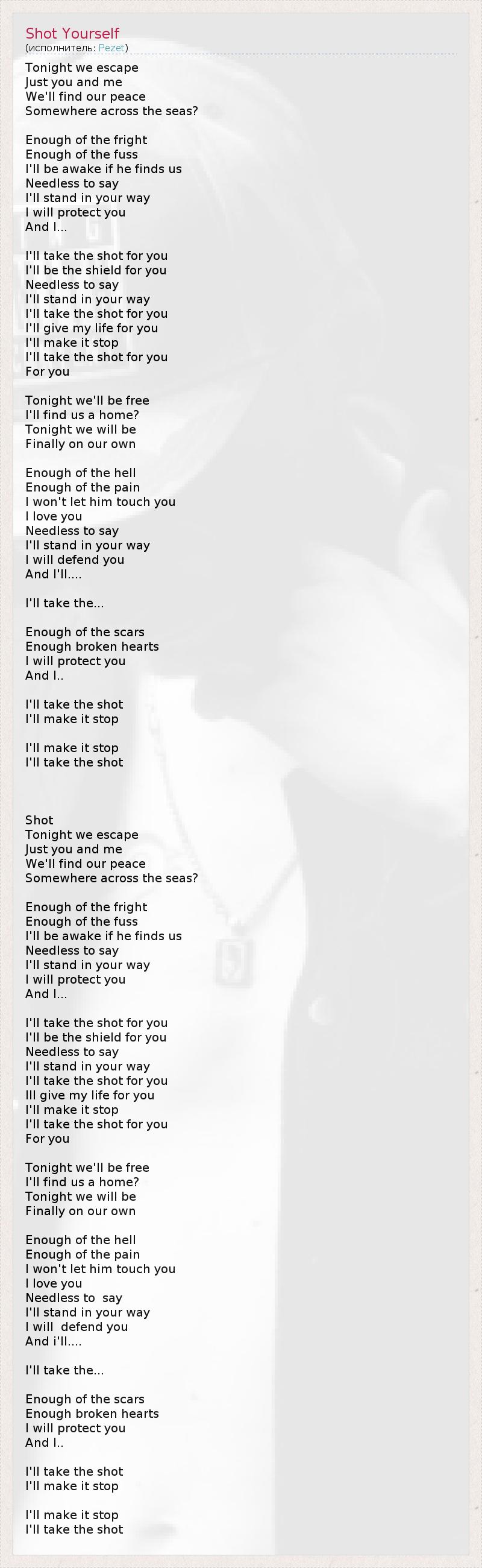Tonight we escape Just you and me We'll find our peace Somewhere across the seas? Enough of the fright Enough of the fuss I'll be awake if he finds us Needless to say I'll stand in your way I will protect you And I... I'll take the shot for you I'll be the shield for you Needless to say I'll stand in your way I'll take the shot for you I'll give my life for you I'll make it stop I'll take the shot for you For you Tonight we'll be free I'll find us a home? Tonight we will be Finally on our own Enough of the hell Enough of the pain I won't let him touch you I love you Needless to say I'll stand in your way I will defend you And I'll.... I'll take the... Enough of the scars Enough broken hearts I will protect you And I.. I'll take the shot I'll make it stop I'll make it stop I'll take the shot Shot Tonight we escape Just you and me We'll find our peace Somewhere across the seas? Enough of the fright Enough of the fuss I'll be awake if he finds us Needless to say I'll stand in your way I will protect you And I... I'll take the shot for you I'll be the shield for you Needless to say I'll stand in your way I'll take the shot for you Ill give my life for you I'll make it stop I'll take the shot for you For you Tonight we'll be free I'll find us a home? Tonight we will be Finally on our own Enough of the hell Enough of the pain I won't let him touch you I love you Needless to say I'll stand in your way I will defend you And i'll.... I'll take the... Enough of the scars Enough broken hearts I will protect you And I.. I'll take the shot I'll make it stop I'll make it stop I'll take the shot