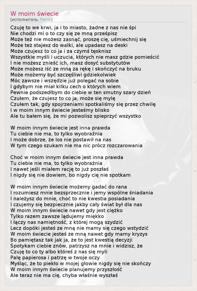 Czuję to we krwi, ja i to miasto, żadne z nas nie śpi Nie chodzi mi o to czy się ze mną prześpisz Może też nie możesz zasnąć, proszę cię, uśmiechnij się Może też stajesz do walki, ale upadasz na deski Może czujesz to co ja i za czymś tęsknisz Wszystkie myśli i uczucia, których nie masz gdzie pomieścić I nie możesz znieść ich, masz dosyć substytutów Może możesz iść ze mną za rękę i skończyć na bruku Może możemy być szczęśliwi gdziekolwiek Móc zawsze i wszędzie już polegać na sobie I gdybym nie miał kilku cech o których wiem Pewnie podszedłbym do ciebie w ten smutny szary dzień Czułem, że czujesz to co ja, może się mylę Czułem tak, gdy spojrzeniami spotkaliśmy się przez chwilę I w moim innym świecie jesteśmy blisko Ale tu bałem się, że mi pozwolisz spieprzyć wszystko W moim innym świecie jest inna prawda Tu ciebie nie ma, to tylko wyobraźnia I może dobrze, że los nie postawił na nas W tym czego szukam nie ma nic prócz rozczarowania Choć w moim innym świecie jest inna prawda Tu ciebie nie ma, to tylko wyobraźnia I nawet jeśli miałem rację to już poszłaś I nigdy się nie dowiem, bo nigdy cię nie spotkam W moim innym świecie możemy gadać do rana I rozumiesz mnie bezsprzecznie i jemy wspólne śniadania I należysz do mnie, choć to nie kwestia posiadania I czujemy się bezpiecznie jakby cały świat był dla nas W moim innym świecie nawet gdy jest ciężko Tylko razem zawsze lądujemy miękko I łączy nas namiętność, z której mogą szydzić Lecz dopóki jesteś ze mną nie mamy się czego wstydzić W moim świecie jesteś ze mną nawet gdy mamy kryzys Bo pamiętasz tak jak ja, że to jest kwestią decyzji Spotykam ciebie znów, patrzysz na mnie i widzisz, że Czuję to co ty albo któreś z nas się myli Palę papierosa i patrzę w twoje oczy Myśląc, że to piekło w mojej głowie nigdy się nie skończy W moim innym świecie planujemy przyszłość Ale teraz nie ma cię, chyba właśnie wyszłaś
