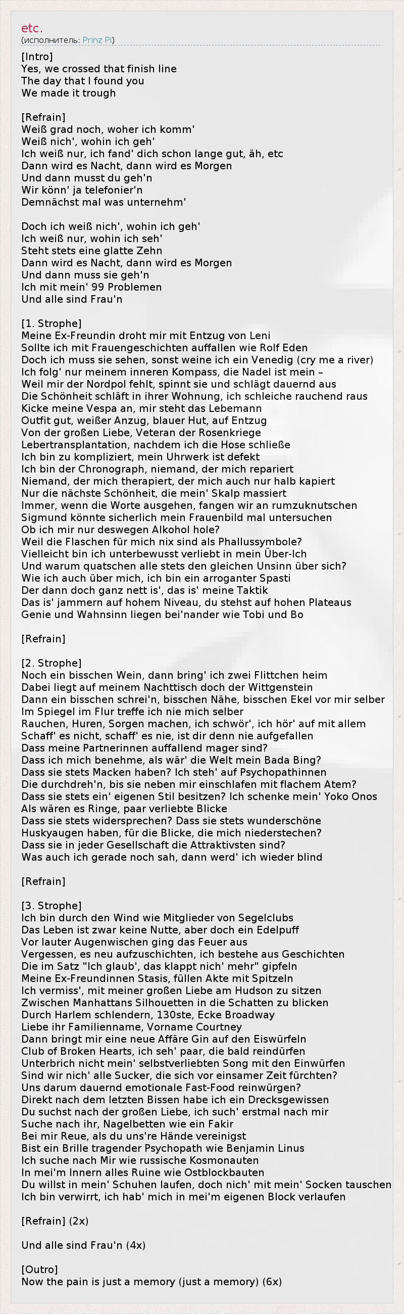 [Intro] Yes, we crossed that finish line The day that I found you We made it trough [Refrain] Weiß grad noch, woher ich komm' Weiß nich', wohin ich geh' Ich weiß nur, ich fand' dich schon lange gut, äh, etc Dann wird es Nacht, dann wird es Morgen Und dann musst du geh'n Wir könn' ja telefonier'n Demnächst mal was unternehm' Doch ich weiß nich', wohin ich geh' Ich weiß nur, wohin ich seh' Steht stets eine glatte Zehn Dann wird es Nacht, dann wird es Morgen Und dann muss sie geh'n Ich mit mein' 99 Problemen Und alle sind Frau'n [1. Strophe] Meine Ex-Freundin droht mir mit Entzug von Leni Sollte ich mit Frauengeschichten auffallen wie Rolf Eden Doch ich muss sie sehen, sonst weine ich ein Venedig (cry me a river) Ich folg' nur meinem inneren Kompass, die Nadel ist mein – Weil mir der Nordpol fehlt, spinnt sie und schlägt dauernd aus Die Schönheit schläft in ihrer Wohnung, ich schleiche rauchend raus Kicke meine Vespa an, mir steht das Lebemann Outfit gut, weißer Anzug, blauer Hut, auf Entzug Von der großen Liebe, Veteran der Rosenkriege Lebertransplantation, nachdem ich die Hose schließe Ich bin zu kompliziert, mein Uhrwerk ist defekt Ich bin der Chronograph, niemand, der mich repariert Niemand, der mich therapiert, der mich auch nur halb kapiert Nur die nächste Schönheit, die mein' Skalp massiert Immer, wenn die Worte ausgehen, fangen wir an rumzuknutschen Sigmund könnte sicherlich mein Frauenbild mal untersuchen Ob ich mir nur deswegen Alkohol hole? Weil die Flaschen für mich nix sind als Phallussymbole? Vielleicht bin ich unterbewusst verliebt in mein Über-Ich Und warum quatschen alle stets den gleichen Unsinn über sich? Wie ich auch über mich, ich bin ein arroganter Spasti Der dann doch ganz nett is', das is' meine Taktik Das is' jammern auf hohem Niveau, du stehst auf hohen Plateaus Genie und Wahnsinn liegen bei'nander wie Tobi und Bo [Refrain] [2. Strophe] Noch ein bisschen Wein, dann bring' ich zwei Flittchen heim Dabei liegt auf meinem Nachttisch doch der Wittgenstein Dann ein bisschen schrei'n, bisschen Nähe, bisschen Ekel vor mir selber Im Spiegel im Flur treffe ich nie mich selber Rauchen, Huren, Sorgen machen, ich schwör', ich hör' auf mit allem Schaff' es nicht, schaff' es nie, ist dir denn nie aufgefallen Dass meine Partnerinnen auffallend mager sind? Dass ich mich benehme, als wär' die Welt mein Bada Bing? Dass sie stets Macken haben? Ich steh' auf Psychopathinnen Die durchdreh'n, bis sie neben mir einschlafen mit flachem Atem? Dass sie stets ein' eigenen Stil besitzen? Ich schenke mein' Yoko Onos Als wären es Ringe, paar verliebte Blicke Dass sie stets widersprechen? Dass sie stets wunderschöne Huskyaugen haben, für die Blicke, die mich niederstechen? Dass sie in jeder Gesellschaft die Attraktivsten sind? Was auch ich gerade noch sah, dann werd' ich wieder blind [Refrain] [3. Strophe] Ich bin durch den Wind wie Mitglieder von Segelclubs Das Leben ist zwar keine Nutte, aber doch ein Edelpuff Vor lauter Augenwischen ging das Feuer aus Vergessen, es neu aufzuschichten, ich bestehe aus Geschichten Die im Satz "Ich glaub', das klappt nich' mehr" gipfeln Meine Ex-Freundinnen Stasis, füllen Akte mit Spitzeln Ich vermiss', mit meiner großen Liebe am Hudson zu sitzen Zwischen Manhattans Silhouetten in die Schatten zu blicken Durch Harlem schlendern, 130ste, Ecke Broadway Liebe ihr Familienname, Vorname Courtney Dann bringt mir eine neue Affäre Gin auf den Eiswürfeln Club of Broken Hearts, ich seh' paar, die bald reindürfen Unterbrich nicht mein' selbstverliebten Song mit den Einwürfen Sind wir nich' alle Sucker, die sich vor einsamer Zeit fürchten? Uns darum dauernd emotionale Fast-Food reinwürgen? Direkt nach dem letzten Bissen habe ich ein Drecksgewissen Du suchst nach der großen Liebe, ich such' erstmal nach mir Suche nach ihr, Nagelbetten wie ein Fakir Bei mir Reue, als du uns're Hände vereinigst Bist ein Brille tragender Psychopath wie Benjamin Linus Ich suche nach Mir wie russische Kosmonauten In mei'm Innern alles Ruine wie Ostblockbauten Du willst in mein' Schuhen laufen, doch nich' mit mein' Socken tauschen Ich bin verwirrt, ich hab' mich in mei'm eigenen Block verlaufen [Refrain] (2x) Und alle sind Frau'n (4x) [Outro] Now the pain is just a memory (just a memory) (6x)