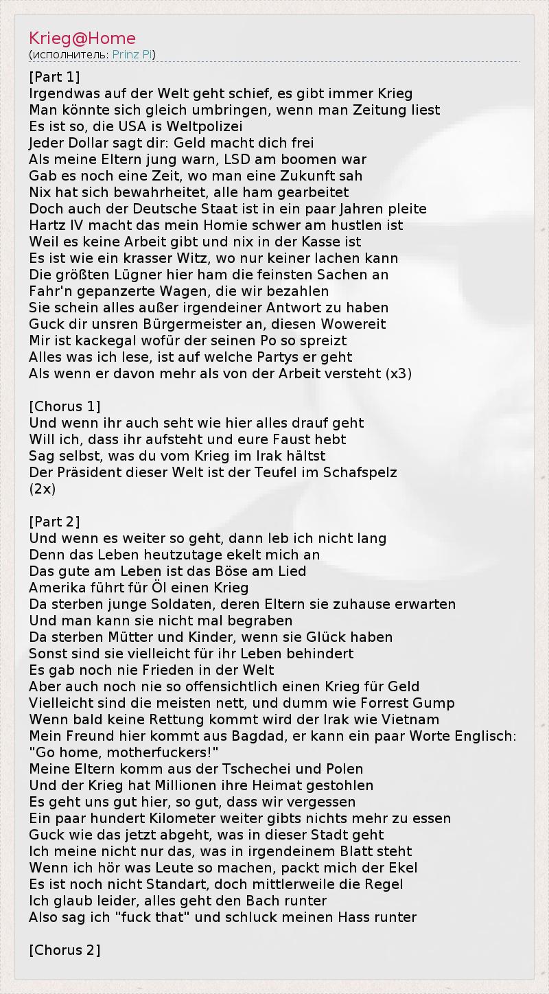 [Part 1] Irgendwas auf der Welt geht schief, es gibt immer Krieg Man könnte sich gleich umbringen, wenn man Zeitung liest Es ist so, die USA is Weltpolizei Jeder Dollar sagt dir: Geld macht dich frei Als meine Eltern jung warn, LSD am boomen war Gab es noch eine Zeit, wo man eine Zukunft sah Nix hat sich bewahrheitet, alle ham gearbeitet Doch auch der Deutsche Staat ist in ein paar Jahren pleite Hartz IV macht das mein Homie schwer am hustlen ist Weil es keine Arbeit gibt und nix in der Kasse ist Es ist wie ein krasser Witz, wo nur keiner lachen kann Die größten Lügner hier ham die feinsten Sachen an Fahr'n gepanzerte Wagen, die wir bezahlen Sie schein alles außer irgendeiner Antwort zu haben Guck dir unsren Bürgermeister an, diesen Wowereit Mir ist kackegal wofür der seinen Po so spreizt Alles was ich lese, ist auf welche Partys er geht Als wenn er davon mehr als von der Arbeit versteht (x3) [Chorus 1] Und wenn ihr auch seht wie hier alles drauf geht Will ich, dass ihr aufsteht und eure Faust hebt Sag selbst, was du vom Krieg im Irak hältst Der Präsident dieser Welt ist der Teufel im Schafspelz (2x) [Part 2] Und wenn es weiter so geht, dann leb ich nicht lang Denn das Leben heutzutage ekelt mich an Das gute am Leben ist das Böse am Lied Amerika führt für Öl einen Krieg Da sterben junge Soldaten, deren Eltern sie zuhause erwarten Und man kann sie nicht mal begraben Da sterben Mütter und Kinder, wenn sie Glück haben Sonst sind sie vielleicht für ihr Leben behindert Es gab noch nie Frieden in der Welt Aber auch noch nie so offensichtlich einen Krieg für Geld Vielleicht sind die meisten nett, und dumm wie Forrest Gump Wenn bald keine Rettung kommt wird der Irak wie Vietnam Mein Freund hier kommt aus Bagdad, er kann ein paar Worte Englisch: "Go home, motherfuckers!" Meine Eltern komm aus der Tschechei und Polen Und der Krieg hat Millionen ihre Heimat gestohlen Es geht uns gut hier, so gut, dass wir vergessen Ein paar hundert Kilometer weiter gibts nichts mehr zu essen Guck wie das jetzt abgeht, was in dieser Stadt geht Ich meine nicht nur das, was in irgendeinem Blatt steht Wenn ich hör was Leute so machen, packt mich der Ekel Es ist noch nicht Standart, doch mittlerweile die Regel Ich glaub leider, alles geht den Bach runter Also sag ich "fuck that" und schluck meinen Hass runter [Chorus 2]