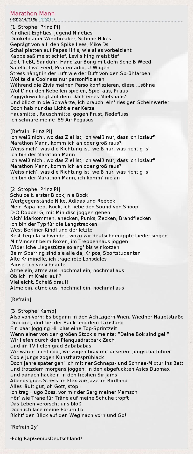 [1. Strophe: Prinz Pi] Kindheit Eighties, Jugend Nineties Dunkelblauer Windbreaker, Schuhe Nikes Geprägt von all' den Spike Lees, Mike Ds Schallplatten auf Papas Hifis, wie alles vorbeizieht Kappe saß meist schief, Levi's hing meist tief Zeit fließt, Sanduhr, Hand zur Bong mit dem Scheiß-Weed Satellit-Live-Feed, Piratenradio, Ü-Wagen Stress hängt in der Luft wie der Duft von den Sprühfarben Wollte die Coolness nur personifizieren Während die Zivis meinen Perso konfiszieren, diese ...söhne Wollt' nur den Rebellen spielen, Spiel aus, Pi aus Ziggydown liegt auf dem Dach eines Mietshaus' Und blickt in die Schwärze, ich brauch' ein' riesigen Scheinwerfer Doch hab nur das Licht einer Kerze Hausmittel, Rauschmittel gegen Frust, Redefluss Ich schnüre meine '89 Air Pegasus [Refrain: Prinz Pi] Ich weiß nich', wo das Ziel ist, ich weiß nur, dass ich loslauf' Marathon Mann, komm ich an oder groß raus? Weiss nich', was die Richtung ist, weiß nur, was richtig is' Ich bin der Marathon Mann Ich weiß nich', wo das Ziel ist, ich weiß nur, dass ich loslauf' Marathon Mann, komm ich an oder groß raus? Weiss nich', was die Richtung ist, weiß nur, was richtig is' Ich bin der Marathon Mann, ich komm' nie an! [2. Strophe: Prinz Pi] Schulzeit, erster Block, nie Bock Wertgegenstände Nike, Adidas und Reebok Mein Papa liebt Rock, ich liebe den Sound von Snoop D-O Doppel G, mit Minidisc joggen gehen Nich' klarkommen, anecken, Punks, Zecken, Brandflecken Ich bin der Typ für die Langstrecken West-Berliner-Kindl und der letzte Rest Tequila schwindet, wozu wir deutschgerappte Lieder singen Mit Vincent beim Boxen, im Treppenhaus joggen Widerliche Liegestütze solang' bis wir kotzen Beim Sparring sind sie alle da, Kripos, Sportstudenten Alte Kriminelle, ich trage rote Lonsdales Pause, ich verschnaufe Atme ein, atme aus, nochmal ein, nochmal aus Ob ich im Kreis lauf'? Vielleicht, Scheiß drauf! Atme ein, atme aus, nochmal ein, nochmal aus [Refrain] [3. Strophe: Kamp] Also von vorn: Es begann in den Achtzigern Wien, Wiedner Hauptstraße Drei drei, dort bei der Bank und dem Taxistand Ein paar Jogging Hi, plus eine Top-Sprintzeit Wenn einer von den großen Stockis meinte: "Deine Bok sind geil" Wir liefen durch den Planquadratpark Zach Und im TV liefen grad Babababas Wir waren nicht cool, wir zogen brav mit unserem Jungscharführer Coole Jungs zogen Kunstharzsprühlack Doch Jahre später geh' ich mit ner Schnaps- und Schnee-Mixtur ins Bett Und trotzdem morgens joggen, in den abgefuckten Asics Duomax Und danach hackeln in den freshen Sir Jams Abends gibts Stress im Flex wie Jazz im Birdland Alles läuft gut, oh Gott, stop! Ich trag Hugo Boss, vor mir der Sarg meiner Mamsch Hör' wie Träne für Träne auf meine Schuhe tropft Das Leben verorscht uns bloß Doch ich lace meine Forum Lo Richt' den Blick auf den Weg nach vorn und Go! [Refrain 2y] -Folg RapGeniusDeutschland!