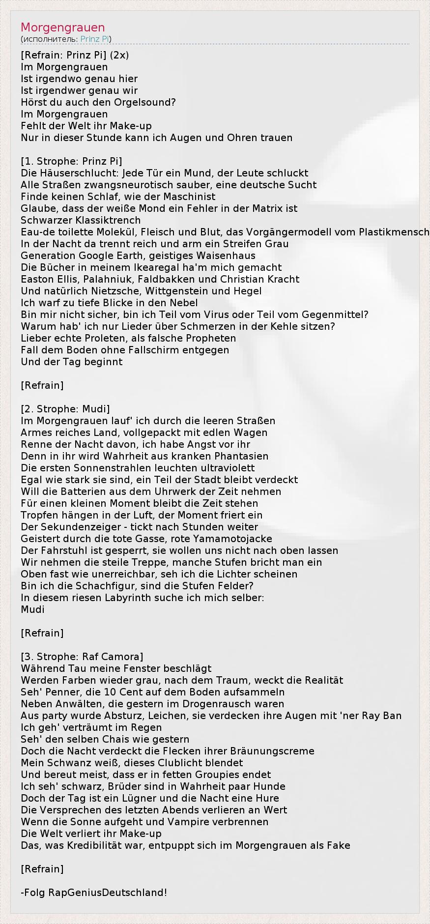 [Refrain: Prinz Pi] (2x) Im Morgengrauen Ist irgendwo genau hier Ist irgendwer genau wir Hörst du auch den Orgelsound? Im Morgengrauen Fehlt der Welt ihr Make-up Nur in dieser Stunde kann ich Augen und Ohren trauen [1. Strophe: Prinz Pi] Die Häuserschlucht: Jede Tür ein Mund, der Leute schluckt Alle Straßen zwangsneurotisch sauber, eine deutsche Sucht Finde keinen Schlaf, wie der Maschinist Glaube, dass der weiße Mond ein Fehler in der Matrix ist Schwarzer Klassiktrench Eau-de toilette Molekül, Fleisch und Blut, das Vorgängermodell vom Plastikmensch In der Nacht da trennt reich und arm ein Streifen Grau Generation Google Earth, geistiges Waisenhaus Die Bücher in meinem Ikearegal ha'm mich gemacht Easton Ellis, Palahniuk, Faldbakken und Christian Kracht Und natürlich Nietzsche, Wittgenstein und Hegel Ich warf zu tiefe Blicke in den Nebel Bin mir nicht sicher, bin ich Teil vom Virus oder Teil vom Gegenmittel? Warum hab' ich nur Lieder über Schmerzen in der Kehle sitzen? Lieber echte Proleten, als falsche Propheten Fall dem Boden ohne Fallschirm entgegen Und der Tag beginnt [Refrain] [2. Strophe: Mudi] Im Morgengrauen lauf' ich durch die leeren Straßen Armes reiches Land, vollgepackt mit edlen Wagen Renne der Nacht davon, ich habe Angst vor ihr Denn in ihr wird Wahrheit aus kranken Phantasien Die ersten Sonnenstrahlen leuchten ultraviolett Egal wie stark sie sind, ein Teil der Stadt bleibt verdeckt Will die Batterien aus dem Uhrwerk der Zeit nehmen Für einen kleinen Moment bleibt die Zeit stehen Tropfen hängen in der Luft, der Moment friert ein Der Sekundenzeiger - tickt nach Stunden weiter Geistert durch die tote Gasse, rote Yamamotojacke Der Fahrstuhl ist gesperrt, sie wollen uns nicht nach oben lassen Wir nehmen die steile Treppe, manche Stufen bricht man ein Oben fast wie unerreichbar, seh ich die Lichter scheinen Bin ich die Schachfigur, sind die Stufen Felder? In diesem riesen Labyrinth suche ich mich selber: Mudi [Refrain] [3. Strophe: Raf Camora] Während Tau meine Fenster beschlägt Werden Farben wieder grau, nach dem Traum, weckt die Realität Seh' Penner, die 10 Cent auf dem Boden aufsammeln Neben Anwälten, die gestern im Drogenrausch waren Aus party wurde Absturz, Leichen, sie verdecken ihre Augen mit 'ner Ray Ban Ich geh' verträumt im Regen Seh' den selben Chais wie gestern Doch die Nacht verdeckt die Flecken ihrer Bräunungscreme Mein Schwanz weiß, dieses Clublicht blendet Und bereut meist, dass er in fetten Groupies endet Ich seh' schwarz, Brüder sind in Wahrheit paar Hunde Doch der Tag ist ein Lügner und die Nacht eine Hure Die Versprechen des letzten Abends verlieren an Wert Wenn die Sonne aufgeht und Vampire verbrennen Die Welt verliert ihr Make-up Das, was Kredibilität war, entpuppt sich im Morgengrauen als Fake [Refrain] -Folg RapGeniusDeutschland!