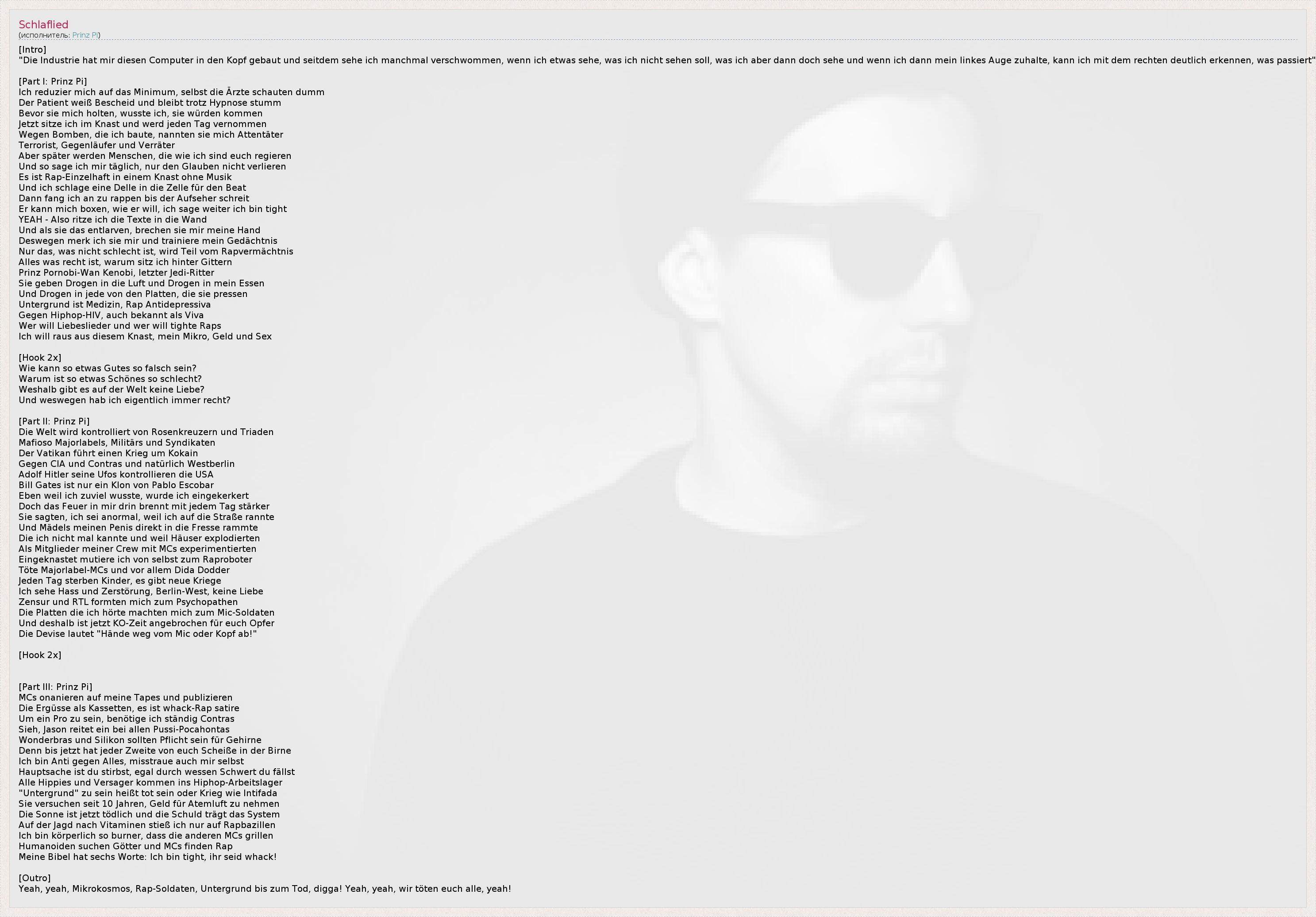 [Intro] "Die Industrie hat mir diesen Computer in den Kopf gebaut und seitdem sehe ich manchmal verschwommen, wenn ich etwas sehe, was ich nicht sehen soll, was ich aber dann doch sehe und wenn ich dann mein linkes Auge zuhalte, kann ich mit dem rechten deutlich erkennen, was passiert" [Part I: Prinz Pi] Ich reduzier mich auf das Minimum, selbst die Ärzte schauten dumm Der Patient weiß Bescheid und bleibt trotz Hypnose stumm Bevor sie mich holten, wusste ich, sie würden kommen Jetzt sitze ich im Knast und werd jeden Tag vernommen Wegen Bomben, die ich baute, nannten sie mich Attentäter Terrorist, Gegenläufer und Verräter Aber später werden Menschen, die wie ich sind euch regieren Und so sage ich mir täglich, nur den Glauben nicht verlieren Es ist Rap-Einzelhaft in einem Knast ohne Musik Und ich schlage eine Delle in die Zelle für den Beat Dann fang ich an zu rappen bis der Aufseher schreit Er kann mich boxen, wie er will, ich sage weiter ich bin tight YEAH - Also ritze ich die Texte in die Wand Und als sie das entlarven, brechen sie mir meine Hand Deswegen merk ich sie mir und trainiere mein Gedächtnis Nur das, was nicht schlecht ist, wird Teil vom Rapvermächtnis Alles was recht ist, warum sitz ich hinter Gittern Prinz Pornobi-Wan Kenobi, letzter Jedi-Ritter Sie geben Drogen in die Luft und Drogen in mein Essen Und Drogen in jede von den Platten, die sie pressen Untergrund ist Medizin, Rap Antidepressiva Gegen Hiphop-HIV, auch bekannt als Viva Wer will Liebeslieder und wer will tighte Raps Ich will raus aus diesem Knast, mein Mikro, Geld und Sex [Hook 2x] Wie kann so etwas Gutes so falsch sein? Warum ist so etwas Schönes so schlecht? Weshalb gibt es auf der Welt keine Liebe? Und weswegen hab ich eigentlich immer recht? [Part II: Prinz Pi] Die Welt wird kontrolliert von Rosenkreuzern und Triaden Mafioso Majorlabels, Militärs und Syndikaten Der Vatikan führt einen Krieg um Kokain Gegen CIA und Contras und natürlich Westberlin Adolf Hitler seine Ufos kontrollieren die USA Bill Gates ist nur ein Klon von Pablo Escobar Eben weil ich zuviel wusste, wurde ich eingekerkert Doch das Feuer in mir drin brennt mit jedem Tag stärker Sie sagten, ich sei anormal, weil ich auf die Straße rannte Und Mädels meinen Penis direkt in die Fresse rammte Die ich nicht mal kannte und weil Häuser explodierten Als Mitglieder meiner Crew mit MCs experimentierten Eingeknastet mutiere ich von selbst zum Raproboter Töte Majorlabel-MCs und vor allem Dida Dodder Jeden Tag sterben Kinder, es gibt neue Kriege Ich sehe Hass und Zerstörung, Berlin-West, keine Liebe Zensur und RTL formten mich zum Psychopathen Die Platten die ich hörte machten mich zum Mic-Soldaten Und deshalb ist jetzt KO-Zeit angebrochen für euch Opfer Die Devise lautet "Hände weg vom Mic oder Kopf ab!" [Hook 2x] [Part III: Prinz Pi] MCs onanieren auf meine Tapes und publizieren Die Ergüsse als Kassetten, es ist whack-Rap satire Um ein Pro zu sein, benötige ich ständig Contras Sieh, Jason reitet ein bei allen Pussi-Pocahontas Wonderbras und Silikon sollten Pflicht sein für Gehirne Denn bis jetzt hat jeder Zweite von euch Scheiße in der Birne Ich bin Anti gegen Alles, misstraue auch mir selbst Hauptsache ist du stirbst, egal durch wessen Schwert du fällst Alle Hippies und Versager kommen ins Hiphop-Arbeitslager "Untergrund" zu sein heißt tot sein oder Krieg wie Intifada Sie versuchen seit 10 Jahren, Geld für Atemluft zu nehmen Die Sonne ist jetzt tödlich und die Schuld trägt das System Auf der Jagd nach Vitaminen stieß ich nur auf Rapbazillen Ich bin körperlich so burner, dass die anderen MCs grillen Humanoiden suchen Götter und MCs finden Rap Meine Bibel hat sechs Worte: Ich bin tight, ihr seid whack! [Outro] Yeah, yeah, Mikrokosmos, Rap-Soldaten, Untergrund bis zum Tod, digga! Yeah, yeah, wir töten euch alle, yeah!