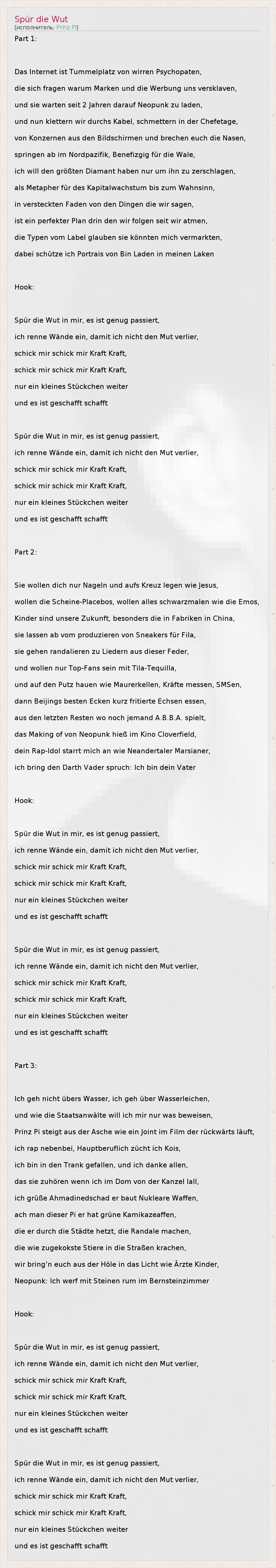 Part 1: Das Internet ist Tummelplatz von wirren Psychopaten, die sich fragen warum Marken und die Werbung uns versklaven, und sie warten seit 2 Jahren darauf Neopunk zu laden, und nun klettern wir durchs Kabel, schmettern in der Chefetage, von Konzernen aus den Bildschirmen und brechen euch die Nasen, springen ab im Nordpazifik, Benefizgig für die Wale, ich will den größten Diamant haben nur um ihn zu zerschlagen, als Metapher für des Kapitalwachstum bis zum Wahnsinn, in versteckten Faden von den Dingen die wir sagen, ist ein perfekter Plan drin den wir folgen seit wir atmen, die Typen vom Label glauben sie könnten mich vermarkten, dabei schütze ich Portrais von Bin Laden in meinen Laken Hook: Spür die Wut in mir, es ist genug passiert, ich renne Wände ein, damit ich nicht den Mut verlier, schick mir schick mir Kraft Kraft, schick mir schick mir Kraft Kraft, nur ein kleines Stückchen weiter und es ist geschafft schafft Spür die Wut in mir, es ist genug passiert, ich renne Wände ein, damit ich nicht den Mut verlier, schick mir schick mir Kraft Kraft, schick mir schick mir Kraft Kraft, nur ein kleines Stückchen weiter und es ist geschafft schafft Part 2: Sie wollen dich nur Nageln und aufs Kreuz legen wie Jesus, wollen die Scheine-Placebos, wollen alles schwarzmalen wie die Emos, Kinder sind unsere Zukunft, besonders die in Fabriken in China, sie lassen ab vom produzieren von Sneakers für Fila, sie gehen randalieren zu Liedern aus dieser Feder, und wollen nur Top-Fans sein mit Tila-Tequilla, und auf den Putz hauen wie Maurerkellen, Kräfte messen, SMSen, dann Beijings besten Ecken kurz fritierte Echsen essen, aus den letzten Resten wo noch jemand A.B.B.A. spielt, das Making of von Neopunk hieß im Kino Cloverfield, dein Rap-Idol starrt mich an wie Neandertaler Marsianer, ich bring den Darth Vader spruch: Ich bin dein Vater Hook: Spür die Wut in mir, es ist genug passiert, ich renne Wände ein, damit ich nicht den Mut verlier, schick mir schick mir Kraft Kraft, schick mir schick mir Kraft Kraft, nur ein kleines Stückchen weiter und es ist geschafft schafft Spür die Wut in mir, es ist genug passiert, ich renne Wände ein, damit ich nicht den Mut verlier, schick mir schick mir Kraft Kraft, schick mir schick mir Kraft Kraft, nur ein kleines Stückchen weiter und es ist geschafft schafft Part 3: Ich geh nicht übers Wasser, ich geh über Wasserleichen, und wie die Staatsanwälte will ich mir nur was beweisen, Prinz Pi steigt aus der Asche wie ein Joint im Film der rückwärts läuft, ich rap nebenbei, Hauptberuflich zücht ich Kois, ich bin in den Trank gefallen, und ich danke allen, das sie zuhören wenn ich im Dom von der Kanzel lall, ich grüße Ahmadinedschad er baut Nukleare Waffen, ach man dieser Pi er hat grüne Kamikazeaffen, die er durch die Städte hetzt, die Randale machen, die wie zugekokste Stiere in die Straßen krachen, wir bring'n euch aus der Höle in das Licht wie Ärzte Kinder, Neopunk: Ich werf mit Steinen rum im Bernsteinzimmer Hook: Spür die Wut in mir, es ist genug passiert, ich renne Wände ein, damit ich nicht den Mut verlier, schick mir schick mir Kraft Kraft, schick mir schick mir Kraft Kraft, nur ein kleines Stückchen weiter und es ist geschafft schafft Spür die Wut in mir, es ist genug passiert, ich renne Wände ein, damit ich nicht den Mut verlier, schick mir schick mir Kraft Kraft, schick mir schick mir Kraft Kraft, nur ein kleines Stückchen weiter und es ist geschafft schafft