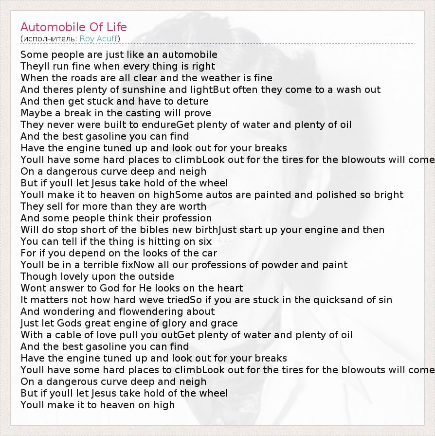 Some people are just like an automobile Theyll run fine when every thing is right When the roads are all clear and the weather is fine And theres plenty of sunshine and lightBut often they come to a wash out And then get stuck and have to deture Maybe a break in the casting will prove They never were built to endureGet plenty of water and plenty of oil And the best gasoline you can find Have the engine tuned up and look out for your breaks Youll have some hard places to climbLook out for the tires for the blowouts will come On a dangerous curve deep and neigh But if youll let Jesus take hold of the wheel Youll make it to heaven on highSome autos are painted and polished so bright They sell for more than they are worth And some people think their profession Will do stop short of the bibles new birthJust start up your engine and then You can tell if the thing is hitting on six For if you depend on the looks of the car Youll be in a terrible fixNow all our professions of powder and paint Though lovely upon the outside Wont answer to God for He looks on the heart It matters not how hard weve triedSo if you are stuck in the quicksand of sin And wondering and flowendering about Just let Gods great engine of glory and grace With a cable of love pull you outGet plenty of water and plenty of oil And the best gasoline you can find Have the engine tuned up and look out for your breaks Youll have some hard places to climbLook out for the tires for the blowouts will come On a dangerous curve deep and neigh But if youll let Jesus take hold of the wheel Youll make it to heaven on high