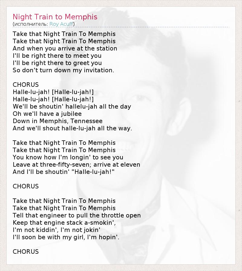 Take that Night Train To Memphis Take that Night Train To Memphis And when you arrive at the station I'll be right there to meet you I'll be right there to greet you So don't turn down my invitation. CHORUS Halle-lu-jah! [Halle-lu-jah!] Halle-lu-jah! [Halle-lu-jah!] We'll be shoutin' hallelu-jah all the day Oh we'll have a jubilee Down in Memphis, Tennessee And we'll shout halle-lu-jah all the way. Take that Night Train To Memphis Take that Night Train To Memphis You know how I'm longin' to see you Leave at three-fifty-seven; arrive at eleven And I'll be shoutin' "Halle-lu-jah!" CHORUS Take that Night Train To Memphis Take that Night Train To Memphis Tell that engineer to pull the throttle open Keep that engine stack a-smokin', I'm not kiddin', I'm not jokin' I'll soon be with my girl, I'm hopin'. CHORUS