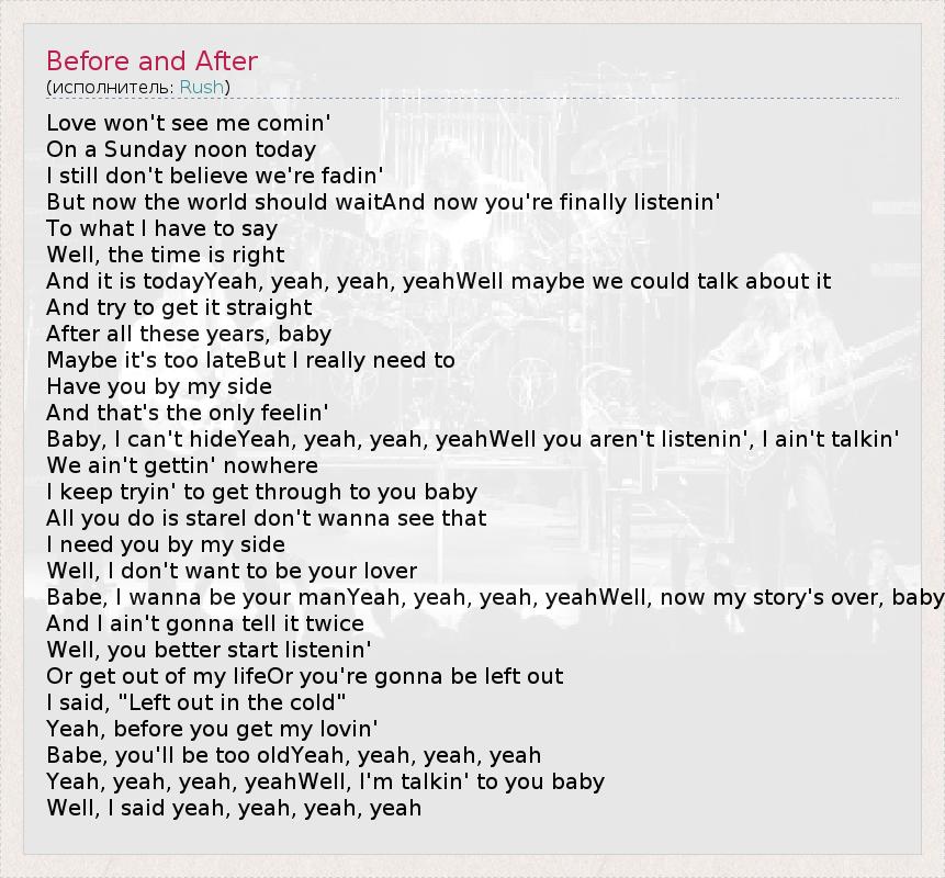 Love won't see me comin' On a Sunday noon today I still don't believe we're fadin' But now the world should waitAnd now you're finally listenin' To what I have to say Well, the time is right And it is todayYeah, yeah, yeah, yeahWell maybe we could talk about it And try to get it straight After all these years, baby Maybe it's too lateBut I really need to Have you by my side And that's the only feelin' Baby, I can't hideYeah, yeah, yeah, yeahWell you aren't listenin', I ain't talkin' We ain't gettin' nowhere I keep tryin' to get through to you baby All you do is stareI don't wanna see that I need you by my side Well, I don't want to be your lover Babe, I wanna be your manYeah, yeah, yeah, yeahWell, now my story's over, baby And I ain't gonna tell it twice Well, you better start listenin' Or get out of my lifeOr you're gonna be left out I said, "Left out in the cold" Yeah, before you get my lovin' Babe, you'll be too oldYeah, yeah, yeah, yeah Yeah, yeah, yeah, yeahWell, I'm talkin' to you baby Well, I said yeah, yeah, yeah, yeah