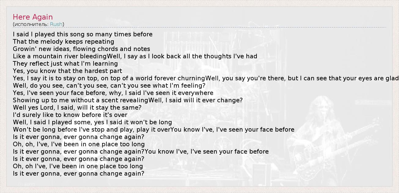 I said I played this song so many times before That the melody keeps repeating Growin' new ideas, flowing chords and notes Like a mountain river bleedingWell, I say as I look back all the thoughts I've had They reflect just what I'm learning Yes, you know that the hardest part Yes, I say it is to stay on top, on top of a world forever churningWell, you say you're there, but I can see that your eyes are glad Well, do you see, can't you see, can't you see what I'm feeling? Yes, I've seen your face before, why, I said I've seen it everywhere Showing up to me without a scent revealingWell, I said will it ever change? Well yes Lord, I said, will it stay the same? I'd surely like to know before it's over Well, I said I played some, yes I said it won't be long Won't be long before I've stop and play, play it overYou know I've, I've seen your face before Is it ever gonna, ever gonna change again? Oh, oh, I've, I've been in one place too long Is it ever gonna, ever gonna change again?You know I've, I've seen your face before Is it ever gonna, ever gonna change again? Oh, oh I've, I've been in one place too long Is it ever gonna, ever gonna change again?