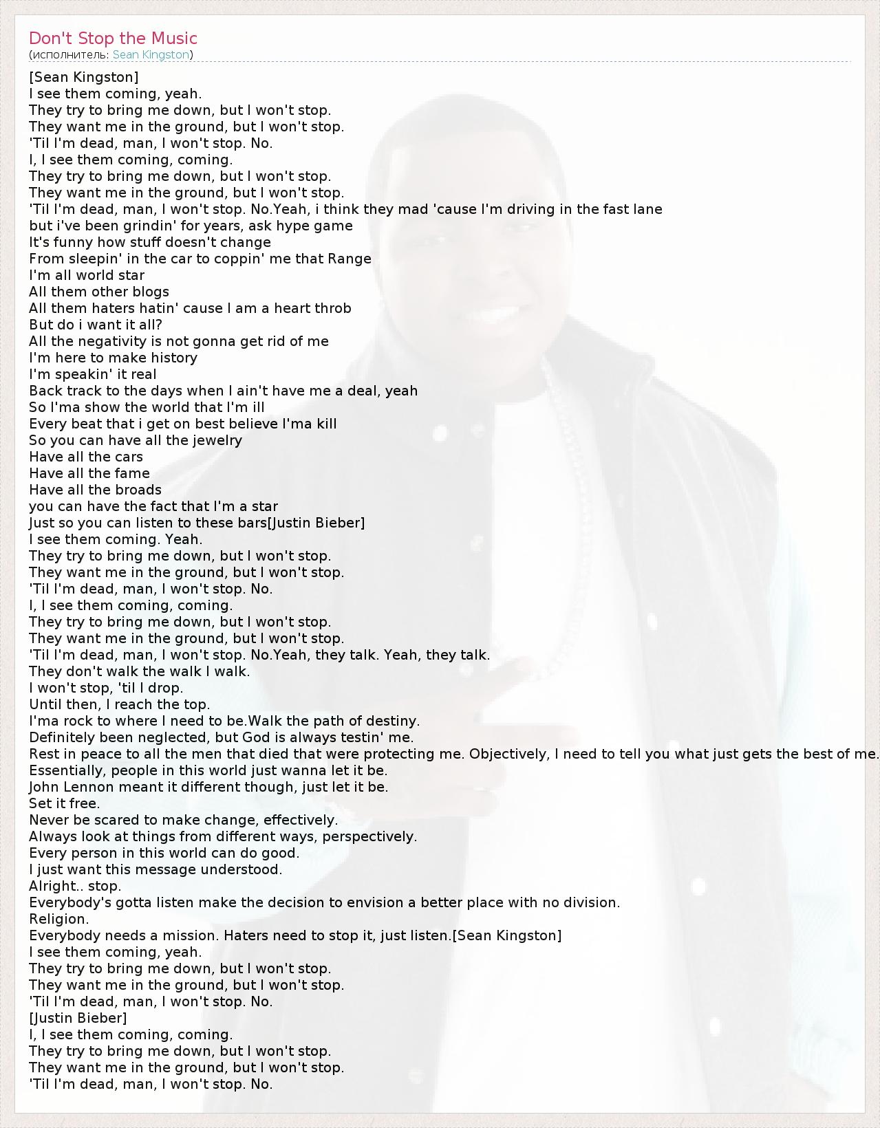 [Sean Kingston] I see them coming, yeah. They try to bring me down, but I won't stop. They want me in the ground, but I won't stop. 'Til I'm dead, man, I won't stop. No. I, I see them coming, coming. They try to bring me down, but I won't stop. They want me in the ground, but I won't stop. 'Til I'm dead, man, I won't stop. No.Yeah, i think they mad 'cause I'm driving in the fast lane but i've been grindin' for years, ask hype game It's funny how stuff doesn't change From sleepin' in the car to coppin' me that Range I'm all world star All them other blogs All them haters hatin' cause I am a heart throb But do i want it all? All the negativity is not gonna get rid of me I'm here to make history I'm speakin' it real Back track to the days when I ain't have me a deal, yeah So I'ma show the world that I'm ill Every beat that i get on best believe I'ma kill So you can have all the jewelry Have all the cars Have all the fame Have all the broads you can have the fact that I'm a star Just so you can listen to these bars[Justin Bieber] I see them coming. Yeah. They try to bring me down, but I won't stop. They want me in the ground, but I won't stop. 'Til I'm dead, man, I won't stop. No. I, I see them coming, coming. They try to bring me down, but I won't stop. They want me in the ground, but I won't stop. 'Til I'm dead, man, I won't stop. No.Yeah, they talk. Yeah, they talk. They don't walk the walk I walk. I won't stop, 'til I drop. Until then, I reach the top. I'ma rock to where I need to be.Walk the path of destiny. Definitely been neglected, but God is always testin' me. Rest in peace to all the men that died that were protecting me. Objectively, I need to tell you what just gets the best of me. Essentially, people in this world just wanna let it be. John Lennon meant it different though, just let it be. Set it free. Never be scared to make change, effectively. Always look at things from different ways, perspectively. Every person in this world can do good. I just want this message understood. Alright.. stop. Everybody's gotta listen make the decision to envision a better place with no division. Religion. Everybody needs a mission. Haters need to stop it, just listen.[Sean Kingston] I see them coming, yeah. They try to bring me down, but I won't stop. They want me in the ground, but I won't stop. 'Til I'm dead, man, I won't stop. No. [Justin Bieber] I, I see them coming, coming. They try to bring me down, but I won't stop. They want me in the ground, but I won't stop. 'Til I'm dead, man, I won't stop. No.