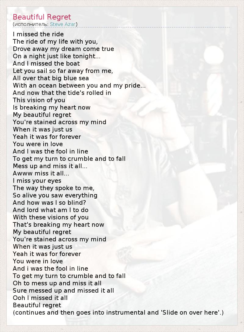 I missed the ride The ride of my life with you, Drove away my dream come true On a night just like tonight... And I missed the boat Let you sail so far away from me, All over that big blue sea With an ocean between you and my pride... And now that the tide's rolled in This vision of you Is breaking my heart now My beautiful regret You're stained across my mind When it was just us Yeah it was for forever You were in love And I was the fool in line To get my turn to crumble and to fall Mess up and miss it all... Awww miss it all... I miss your eyes The way they spoke to me, So alive you saw everything And how was I so blind? And lord what am I to do With these visions of you That's breaking my heart now My beautiful regret You're stained across my mind When it was just us Yeah it was for forever You were in love And i was the fool in line To get my turn to crumble and to fall Oh to mess up and miss it all Sure messed up and missed it all Ooh I missed it all Beautiful regret (continues and then goes into instrumental and 'Slide on over here'.)