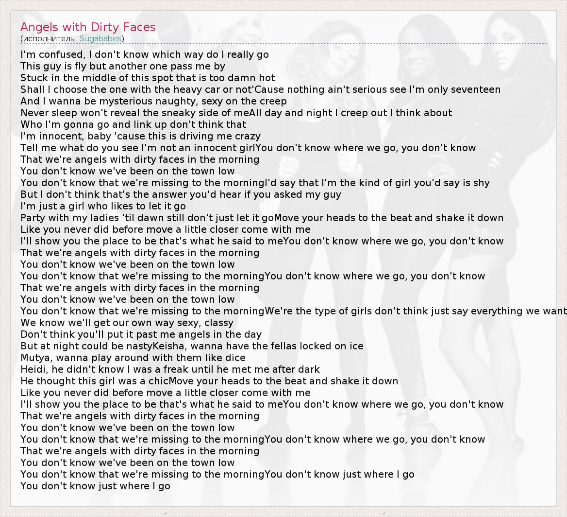I'm confused, I don't know which way do I really go This guy is fly but another one pass me by Stuck in the middle of this spot that is too damn hot Shall I choose the one with the heavy car or not'Cause nothing ain't serious see I'm only seventeen And I wanna be mysterious naughty, sexy on the creep Never sleep won't reveal the sneaky side of meAll day and night I creep out I think about Who I'm gonna go and link up don't think that I'm innocent, baby 'cause this is driving me crazy Tell me what do you see I'm not an innocent girlYou don't know where we go, you don't know That we're angels with dirty faces in the morning You don't know we've been on the town low You don't know that we're missing to the morningI'd say that I'm the kind of girl you'd say is shy But I don't think that's the answer you'd hear if you asked my guy I'm just a girl who likes to let it go Party with my ladies 'til dawn still don't just let it goMove your heads to the beat and shake it down Like you never did before move a little closer come with me I'll show you the place to be that's what he said to meYou don't know where we go, you don't know That we're angels with dirty faces in the morning You don't know we've been on the town low You don't know that we're missing to the morningYou don't know where we go, you don't know That we're angels with dirty faces in the morning You don't know we've been on the town low You don't know that we're missing to the morningWe're the type of girls don't think just say everything we want We know we'll get our own way sexy, classy Don't think you'll put it past me angels in the day But at night could be nastyKeisha, wanna have the fellas locked on ice Mutya, wanna play around with them like dice Heidi, he didn't know I was a freak until he met me after dark He thought this girl was a chicMove your heads to the beat and shake it down Like you never did before move a little closer come with me I'll show you the place to be that's what he said to meYou don't know where we go, you don't know That we're angels with dirty faces in the morning You don't know we've been on the town low You don't know that we're missing to the morningYou don't know where we go, you don't know That we're angels with dirty faces in the morning You don't know we've been on the town low You don't know that we're missing to the morningYou don't know just where I go You don't know just where I go