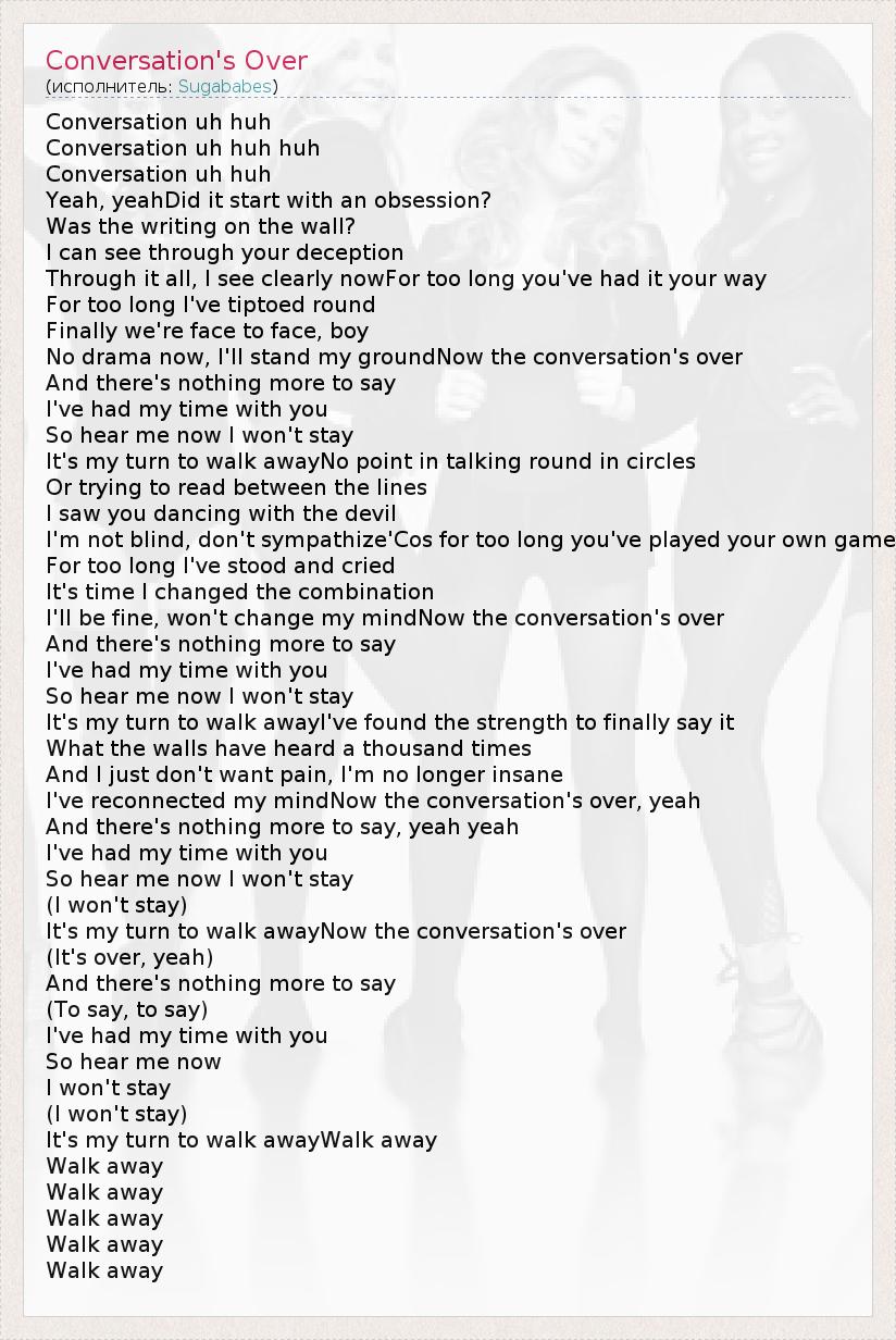 Conversation uh huh Conversation uh huh huh Conversation uh huh Yeah, yeahDid it start with an obsession? Was the writing on the wall? I can see through your deception Through it all, I see clearly nowFor too long you've had it your way For too long I've tiptoed round Finally we're face to face, boy No drama now, I'll stand my groundNow the conversation's over And there's nothing more to say I've had my time with you So hear me now I won't stay It's my turn to walk awayNo point in talking round in circles Or trying to read between the lines I saw you dancing with the devil I'm not blind, don't sympathize'Cos for too long you've played your own game For too long I've stood and cried It's time I changed the combination I'll be fine, won't change my mindNow the conversation's over And there's nothing more to say I've had my time with you So hear me now I won't stay It's my turn to walk awayI've found the strength to finally say it What the walls have heard a thousand times And I just don't want pain, I'm no longer insane I've reconnected my mindNow the conversation's over, yeah And there's nothing more to say, yeah yeah I've had my time with you So hear me now I won't stay (I won't stay) It's my turn to walk awayNow the conversation's over (It's over, yeah) And there's nothing more to say (To say, to say) I've had my time with you So hear me now I won't stay (I won't stay) It's my turn to walk awayWalk away Walk away Walk away Walk away Walk away Walk away