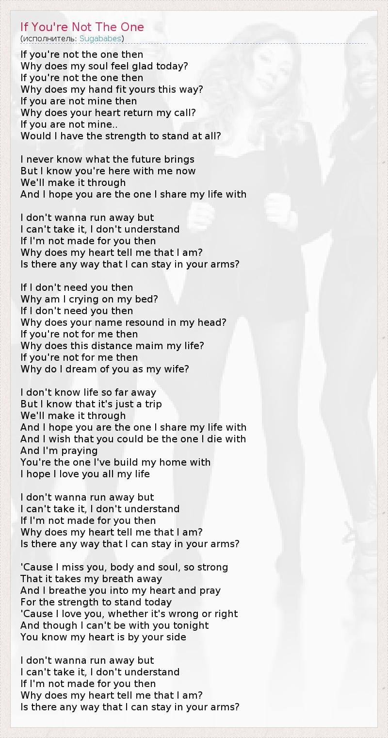 If you're not the one then Why does my soul feel glad today? If you're not the one then Why does my hand fit yours this way? If you are not mine then Why does your heart return my call? If you are not mine.. Would I have the strength to stand at all? I never know what the future brings But I know you're here with me now We'll make it through And I hope you are the one I share my life with I don't wanna run away but I can't take it, I don't understand If I'm not made for you then Why does my heart tell me that I am? Is there any way that I can stay in your arms? If I don't need you then Why am I crying on my bed? If I don't need you then Why does your name resound in my head? If you're not for me then Why does this distance maim my life? If you're not for me then Why do I dream of you as my wife? I don't know life so far away But I know that it's just a trip We'll make it through And I hope you are the one I share my life with And I wish that you could be the one I die with And I'm praying You're the one I've build my home with I hope I love you all my life I don't wanna run away but I can't take it, I don't understand If I'm not made for you then Why does my heart tell me that I am? Is there any way that I can stay in your arms? 'Cause I miss you, body and soul, so strong That it takes my breath away And I breathe you into my heart and pray For the strength to stand today 'Cause I love you, whether it's wrong or right And though I can't be with you tonight You know my heart is by your side I don't wanna run away but I can't take it, I don't understand If I'm not made for you then Why does my heart tell me that I am? Is there any way that I can stay in your arms?