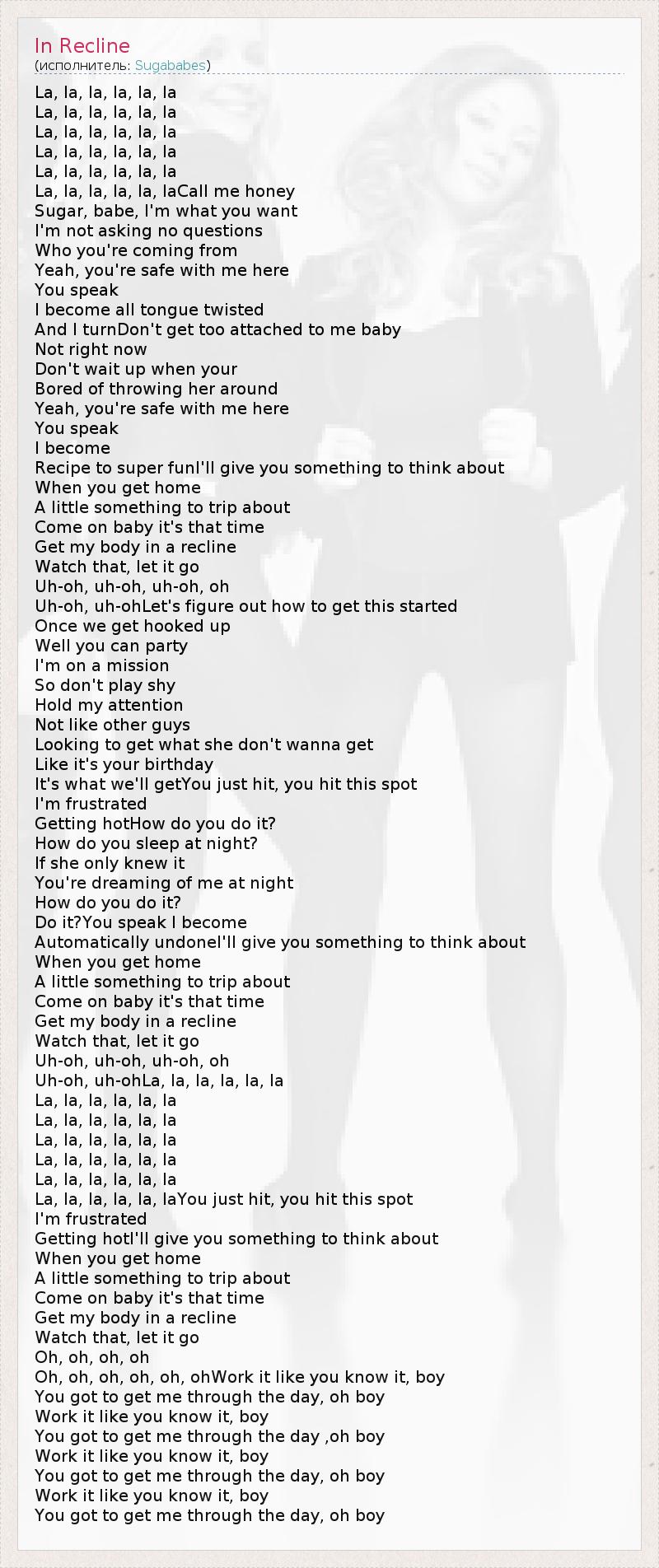 La, la, la, la, la, la La, la, la, la, la, la La, la, la, la, la, la La, la, la, la, la, la La, la, la, la, la, la La, la, la, la, la, laCall me honey Sugar, babe, I'm what you want I'm not asking no questions Who you're coming from Yeah, you're safe with me here You speak I become all tongue twisted And I turnDon't get too attached to me baby Not right now Don't wait up when your Bored of throwing her around Yeah, you're safe with me here You speak I become Recipe to super funI'll give you something to think about When you get home A little something to trip about Come on baby it's that time Get my body in a recline Watch that, let it go Uh-oh, uh-oh, uh-oh, oh Uh-oh, uh-ohLet's figure out how to get this started Once we get hooked up Well you can party I'm on a mission So don't play shy Hold my attention Not like other guys Looking to get what she don't wanna get Like it's your birthday It's what we'll getYou just hit, you hit this spot I'm frustrated Getting hotHow do you do it? How do you sleep at night? If she only knew it You're dreaming of me at night How do you do it? Do it?You speak I become Automatically undoneI'll give you something to think about When you get home A little something to trip about Come on baby it's that time Get my body in a recline Watch that, let it go Uh-oh, uh-oh, uh-oh, oh Uh-oh, uh-ohLa, la, la, la, la, la La, la, la, la, la, la La, la, la, la, la, la La, la, la, la, la, la La, la, la, la, la, la La, la, la, la, la, la La, la, la, la, la, laYou just hit, you hit this spot I'm frustrated Getting hotI'll give you something to think about When you get home A little something to trip about Come on baby it's that time Get my body in a recline Watch that, let it go Oh, oh, oh, oh Oh, oh, oh, oh, oh, ohWork it like you know it, boy You got to get me through the day, oh boy Work it like you know it, boy You got to get me through the day ,oh boy Work it like you know it, boy You got to get me through the day, oh boy Work it like you know it, boy You got to get me through the day, oh boy