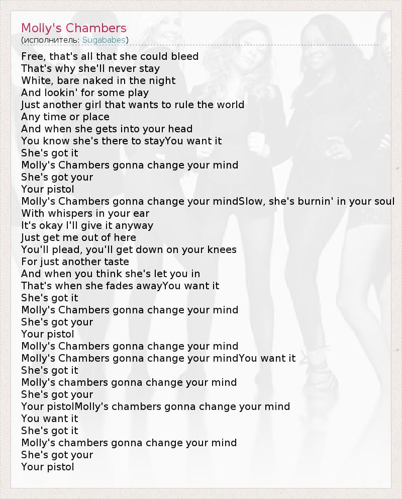 Free, that's all that she could bleed That's why she'll never stay White, bare naked in the night And lookin' for some play Just another girl that wants to rule the world Any time or place And when she gets into your head You know she's there to stayYou want it She's got it Molly's Chambers gonna change your mind She's got your Your pistol Molly's Chambers gonna change your mindSlow, she's burnin' in your soul With whispers in your ear It's okay I'll give it anyway Just get me out of here You'll plead, you'll get down on your knees For just another taste And when you think she's let you in That's when she fades awayYou want it She's got it Molly's Chambers gonna change your mind She's got your Your pistol Molly's Chambers gonna change your mind Molly's Chambers gonna change your mindYou want it She's got it Molly's chambers gonna change your mind She's got your Your pistolMolly's chambers gonna change your mind You want it She's got it Molly's chambers gonna change your mind She's got your Your pistol