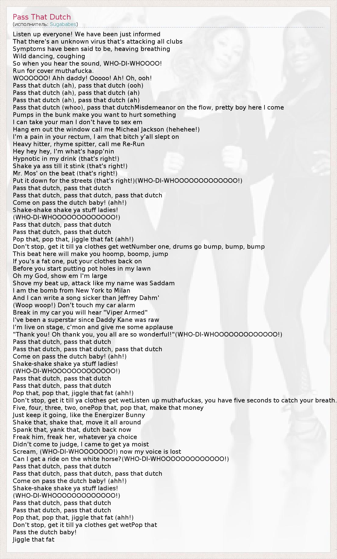 Listen up everyone! We have been just informed That there's an unknown virus that's attacking all clubs Symptoms have been said to be, heaving breathing Wild dancing, coughing So when you hear the sound, WHO-DI-WHOOOO! Run for cover muthafucka. WOOOOOO! Ahh daddy! Ooooo! Ah! Oh, ooh! Pass that dutch (ah), pass that dutch (ooh) Pass that dutch (ah), pass that dutch (ah) Pass that dutch (ah), pass that dutch (ah) Pass that dutch (whoo), pass that dutchMisdemeanor on the flow, pretty boy here I come Pumps in the bunk make you want to hurt something I can take your man I don't have to sex em Hang em out the window call me Micheal Jackson (hehehee!) I'm a pain in your rectum, I am that bitch y'all slept on Heavy hitter, rhyme spitter, call me Re-Run Hey hey hey, I'm what's happ'nin Hypnotic in my drink (that's right!) Shake ya ass till it stink (that's right!) Mr. Mos' on the beat (that's right!) Put it down for the streets (that's right!)(WHO-DI-WHOOOOOOOOOOOOO!) Pass that dutch, pass that dutch Pass that dutch, pass that dutch, pass that dutch Come on pass the dutch baby! (ahh!) Shake-shake shake ya stuff ladies! (WHO-DI-WHOOOOOOOOOOOOO!) Pass that dutch, pass that dutch Pass that dutch, pass that dutch Pop that, pop that, jiggle that fat (ahh!) Don't stop, get it till ya clothes get wetNumber one, drums go bump, bump, bump This beat here will make you hoomp, boomp, jump If you's a fat one, put your clothes back on Before you start putting pot holes in my lawn Oh my God, show em I'm large Shove my beat up, attack like my name was Saddam I am the bomb from New York to Milan And I can write a song sicker than Jeffrey Dahm' (Woop woop!) Don't touch my car alarm Break in my car you will hear "Viper Armed" I've been a superstar since Daddy Kane was raw I'm live on stage, c'mon and give me some applause "Thank you! Oh thank you, you all are so wonderful!"(WHO-DI-WHOOOOOOOOOOOOO!) Pass that dutch, pass that dutch Pass that dutch, pass that dutch, pass that dutch Come on pass the dutch baby! (ahh!) Shake-shake shake ya stuff ladies! (WHO-DI-WHOOOOOOOOOOOOO!) Pass that dutch, pass that dutch Pass that dutch, pass that dutch Pop that, pop that, jiggle that fat (ahh!) Don't stop, get it till ya clothes get wetListen up muthafuckas, you have five seconds to catch your breath. Five, four, three, two, onePop that, pop that, make that money Just keep it going, like the Energizer Bunny Shake that, shake that, move it all around Spank that, yank that, dutch back now Freak him, freak her, whatever ya choice Didn't come to judge, I came to get ya moist Scream, (WHO-DI-WHOOOOOOO!) now my voice is lost Can I get a ride on the white horse?(WHO-DI-WHOOOOOOOOOOOOO!) Pass that dutch, pass that dutch Pass that dutch, pass that dutch, pass that dutch Come on pass the dutch baby! (ahh!) Shake-shake shake ya stuff ladies! (WHO-DI-WHOOOOOOOOOOOOO!) Pass that dutch, pass that dutch Pass that dutch, pass that dutch Pop that, pop that, jiggle that fat (ahh!) Don't stop, get it till ya clothes get wetPop that Pass the dutch baby! Jiggle that fat