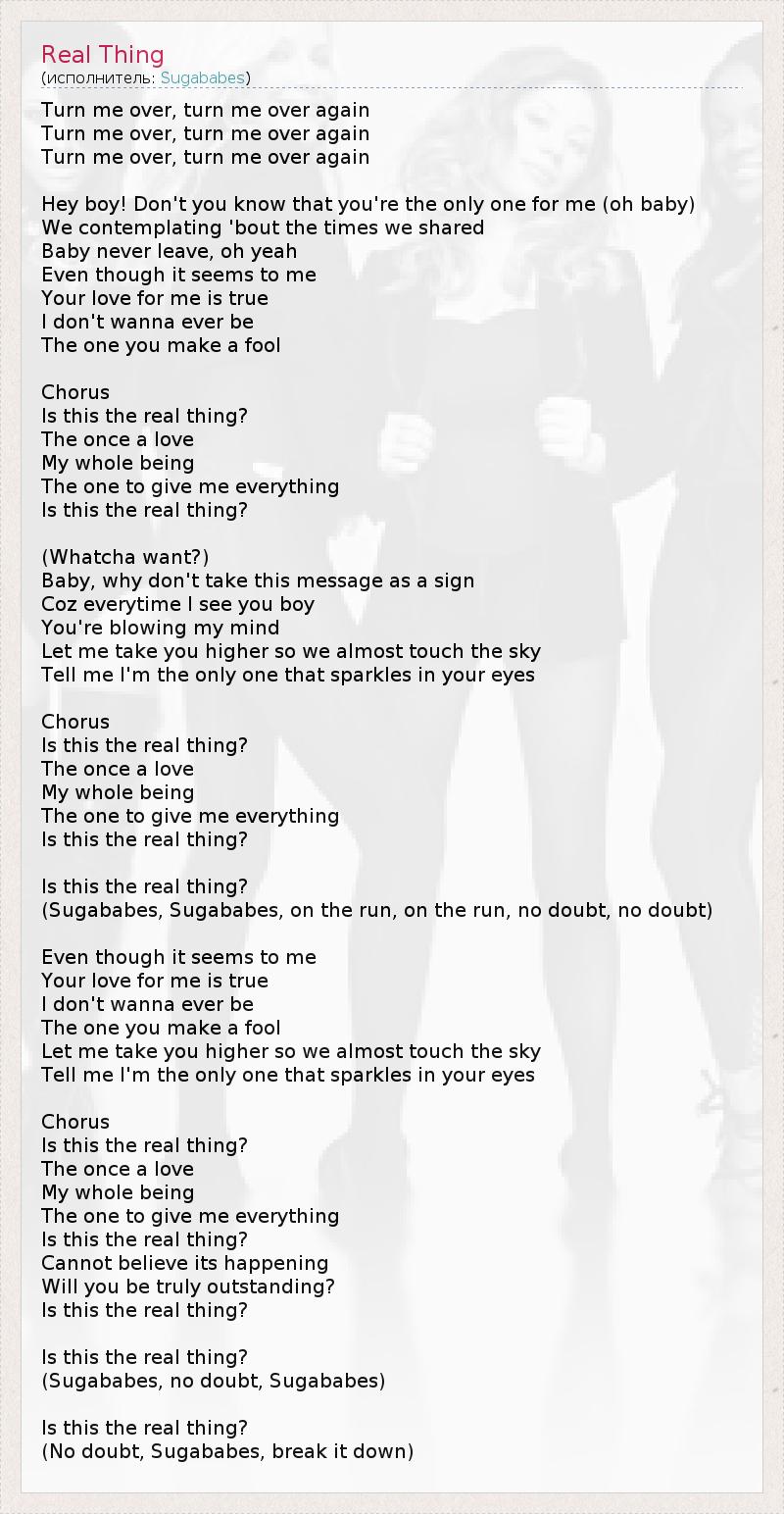 Turn me over, turn me over again Turn me over, turn me over again Turn me over, turn me over again Hey boy! Don't you know that you're the only one for me (oh baby) We contemplating 'bout the times we shared Baby never leave, oh yeah Even though it seems to me Your love for me is true I don't wanna ever be The one you make a fool Chorus Is this the real thing? The once a love My whole being The one to give me everything Is this the real thing? (Whatcha want?) Baby, why don't take this message as a sign Coz everytime I see you boy You're blowing my mind Let me take you higher so we almost touch the sky Tell me I'm the only one that sparkles in your eyes Chorus Is this the real thing? The once a love My whole being The one to give me everything Is this the real thing? Is this the real thing? (Sugababes, Sugababes, on the run, on the run, no doubt, no doubt) Even though it seems to me Your love for me is true I don't wanna ever be The one you make a fool Let me take you higher so we almost touch the sky Tell me I'm the only one that sparkles in your eyes Chorus Is this the real thing? The once a love My whole being The one to give me everything Is this the real thing? Cannot believe its happening Will you be truly outstanding? Is this the real thing? Is this the real thing? (Sugababes, no doubt, Sugababes) Is this the real thing? (No doubt, Sugababes, break it down)