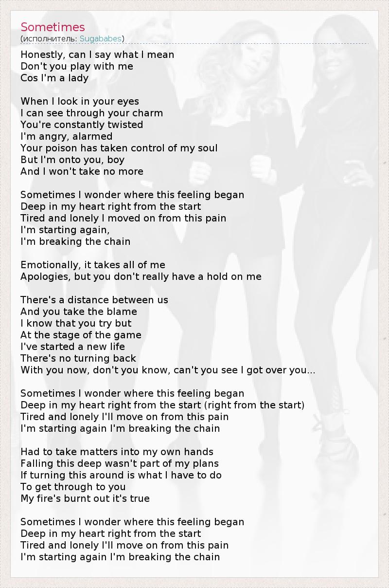 Честно, могу ли я сказать то, что имею в виду? Не смей играть со мной, Ведь я же леди. Когда я смотрю в твои глаза, Я вижу твоё очарование, Ты постоянно меняешься, Я сержусь, волнуюсь, Твой яд взял и подчинил мою душу, Но я все еще влюблена тебя, парень, И больше так не вытерплю... Иногда мне интересно, когда возникло это чувство... В глубине души с самого начала, Усталая и одинокая, я убегала от этой боли, И теперь начинаю сначала, Я разрываю цепь. Это полностью владеет моими эмоциями. Прости, но ты действительно меня не удержишь... Между нами расстояние, И ты берешь вину на себя. Я знаю, что ты пытался, но Пока шла игра, Я начала новую жизнь, И нет возврата К нашим отношениям, разве не знаешь, разве не видишь, что я забыла тебя? Иногда мне интересно, когда возникло это чувство... В глубине души с самого начала, Усталая и одинокая, я убегала от этой боли, И теперь начинаю сначала, я разрываю цепь. Должна была взять дела в свои руки, В мои планы не входило такое далёкое падение. Если я должна приложить усилия, Чтобы достучаться до тебя, То знай, я перегорела, это правда... Иногда мне интересно, когда возникло это чувство... В глубине души с самого начала... Усталая и одинокая, я убегу от этой боли, И теперь начинаю сначала, я разрываю цепь.