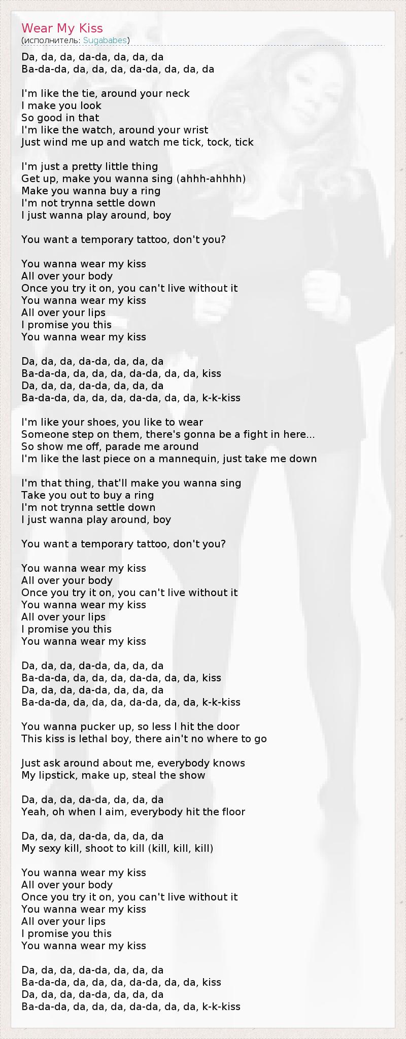 Да, да, да, да-да, да, да, да Ба-да-да, да, да, да, да-да, да, да, да Я как галстук на твоей шее, Благодаря мне Ты отлично смотришься. Я как часы на твоем запястье, Просто заведи меня и любуйся, как я тикаю. Я просто милое маленькое создание, Которое рождает в тебе охоту петь, (ааа-ааа) Вызывает желание купить колечко, И я не успокоюсь, Я просто хочу поиграть с тобой, малыш. Ты хочешь временную татушку, не так ли? Ты хочешь носить мой поцелуй На своем теле, Примеришь его однажды и не сможешь без него жить. Ты хочешь носить мой поцелуй На своих губах... Я обещаю тебе, Ты захочешь носить мой поцелуй... Да, да, да, да-да, да, да, да Ба-да-да, да, да, да, да-да, да, да, да, поцелуй Да, да, да, да-да, да, да, да Ба-да-да, да, да, да, да-да, да, да, да, п-п-поцелуй Я как ботинки, которые ты любишь одевать, Если на них кто-то наступит, точно завяжется драка... Так покажи меня в лучшем свете, продемонстрируй меня, Я как последняя вещь на манекене, просто сними меня! Я то создание, которое заставит тебя петь И вынудит купить колечко, И я не успокоюсь, Я просто хочу поиграть с тобой, малыш. Ты хочешь временную татушку, не так ли? Ты хочешь носить мой поцелуй На своем теле, Примеришь его однажды и не сможешь без него жить. Ты хочешь носить мой поцелуй На своих губах... Я обещаю тебе, Ты захочешь носить мой поцелуй... Да, да, да, да-да, да, да, да Ба-да-да, да, да, да, да-да, да, да, да, поцелуй Да, да, да, да-да, да, да, да Ба-да-да, да, да, да, да-да, да, да, да, п-п-поцелуй Ты морщишься, думаешь я перестану стучать в твою дверь, Этот поцелуй смертелен, и тебе некуда бежать... Просто поспрашивай обо мне, все знают, Что моя помада, мой мейкап притягивают взгляды! Да, да, да, да-да, да, да, да Да, оо, когда я стреляю, то не промахиваюсь! Да, да, да, да-да, да, да, да Моя сексуальность убивает, ее выстрел смертелен (смертелен, смертелен) Ты хочешь носить мой поцелуй На своем теле, Примеришь его однажды и не сможешь без него жить. Ты хочешь носить мой поцелуй На своих губах... Я обещаю тебе, Ты захочешь носить мой поцелуй... Да, да, да, да-да, да, да, да Ба-да-да, да, да, да, да-да, да, да, да, поцелуй Да, да, да, да-да, да, да, да Ба-да-да, да, да, да, да-да, да, да, да, п-п-поцелуй