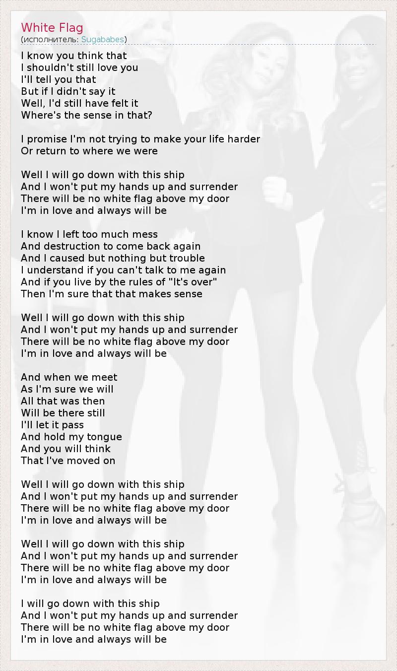 Я знаю, ты думаешь, Что я не должна больше любить тебя, И я говорю тебе об этом. Но если бы я тебе этого не сказала, Я бы всё равно это чувствовала... Есть ли в этом смысл? Я обещаю, что не стану усложнять тебе жизнь Или пытаться вернуть всё назад. Я лучше потону с этим кораблём, Но не подниму руки вверх, чтобы сдаться, Над моей дверью не будет белого флага. Я люблю тебя и всегда буду любить. Я знаю, что наломала дров И теперь не имею права вернуться. Я причиняла тебе только неприятности, И понимаю, почему ты не хочешь разговаривать со мной. Если ты придерживаешься правила: «Всё кончено», То в этом есть смысл. Я лучше потону с этим кораблём, Но не подниму руки вверх, чтобы сдаться, Над моей дверью не будет белого флага. Я люблю тебя и всегда буду любить. А когда мы встретимся, (я уверена, что это произойдёт), Всё, что я испытываю сейчас, Будет со мной и в тот момент. Но я сделаю так, что ты ничего не заметил, Я буду скрывать свои чувства, И ты подумаешь, Что я разлюбила тебя. Я лучше потону с этим кораблём, Но не подниму руки вверх, чтобы сдаться, Над моей дверью не будет белого флага. Я люблю тебя и всегда буду любить. Я лучше потону с этим кораблём, Но не подниму руки вверх, чтобы сдаться, Над моей дверью не будет белого флага. Я люблю тебя и всегда буду любить. Я лучше потону с этим кораблём, Но не подниму руки вверх, чтобы сдаться, Над моей дверью не будет белого флага. Я люблю тебя и всегда буду любить.