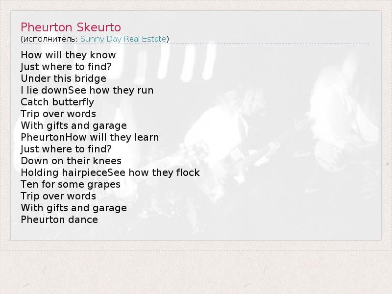 How will they know Just where to find? Under this bridge I lie downSee how they run Catch butterfly Trip over words With gifts and garage PheurtonHow will they learn Just where to find? Down on their knees Holding hairpieceSee how they flock Ten for some grapes Trip over words With gifts and garage Pheurton dance