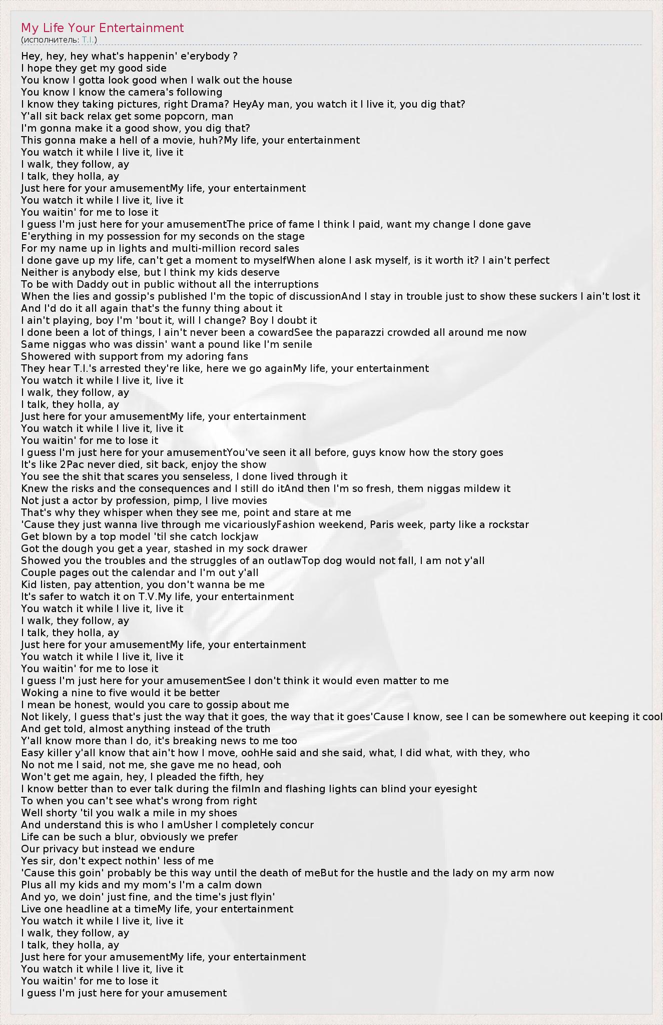 Hey, hey, hey what's happenin' e'erybody ? I hope they get my good side You know I gotta look good when I walk out the house You know I know the camera's following I know they taking pictures, right Drama? HeyAy man, you watch it I live it, you dig that? Y'all sit back relax get some popcorn, man I'm gonna make it a good show, you dig that? This gonna make a hell of a movie, huh?My life, your entertainment You watch it while I live it, live it I walk, they follow, ay I talk, they holla, ay Just here for your amusementMy life, your entertainment You watch it while I live it, live it You waitin' for me to lose it I guess I'm just here for your amusementThe price of fame I think I paid, want my change I done gave E'erything in my possession for my seconds on the stage For my name up in lights and multi-million record sales I done gave up my life, can't get a moment to myselfWhen alone I ask myself, is it worth it? I ain't perfect Neither is anybody else, but I think my kids deserve To be with Daddy out in public without all the interruptions When the lies and gossip's published I'm the topic of discussionAnd I stay in trouble just to show these suckers I ain't lost it And I'd do it all again that's the funny thing about it I ain't playing, boy I'm 'bout it, will I change? Boy I doubt it I done been a lot of things, I ain't never been a cowardSee the paparazzi crowded all around me now Same niggas who was dissin' want a pound like I'm senile Showered with support from my adoring fans They hear T.I.'s arrested they're like, here we go againMy life, your entertainment You watch it while I live it, live it I walk, they follow, ay I talk, they holla, ay Just here for your amusementMy life, your entertainment You watch it while I live it, live it You waitin' for me to lose it I guess I'm just here for your amusementYou've seen it all before, guys know how the story goes It's like 2Pac never died, sit back, enjoy the show You see the shit that scares you senseless, I done lived through it Knew the risks and the consequences and I still do itAnd then I'm so fresh, them niggas mildew it Not just a actor by profession, pimp, I live movies That's why they whisper when they see me, point and stare at me 'Cause they just wanna live through me vicariouslyFashion weekend, Paris week, party like a rockstar Get blown by a top model 'til she catch lockjaw Got the dough you get a year, stashed in my sock drawer Showed you the troubles and the struggles of an outlawTop dog would not fall, I am not y'all Couple pages out the calendar and I'm out y'all Kid listen, pay attention, you don't wanna be me It's safer to watch it on T.V.My life, your entertainment You watch it while I live it, live it I walk, they follow, ay I talk, they holla, ay Just here for your amusementMy life, your entertainment You watch it while I live it, live it You waitin' for me to lose it I guess I'm just here for your amusementSee I don't think it would even matter to me Woking a nine to five would it be better I mean be honest, would you care to gossip about me Not likely, I guess that's just the way that it goes, the way that it goes'Cause I know, see I can be somewhere out keeping it cool And get told, almost anything instead of the truth Y'all know more than I do, it's breaking news to me too Easy killer y'all know that ain't how I move, oohHe said and she said, what, I did what, with they, who No not me I said, not me, she gave me no head, ooh Won't get me again, hey, I pleaded the fifth, hey I know better than to ever talk during the filmIn and flashing lights can blind your eyesight To when you can't see what's wrong from right Well shorty 'til you walk a mile in my shoes And understand this is who I amUsher I completely concur Life can be such a blur, obviously we prefer Our privacy but instead we endure Yes sir, don't expect nothin' less of me 'Cause this goin' probably be this way until the death of meBut for the hustle and the lady on my arm now Plus all my kids and my mom's I'm a calm down And yo, we doin' just fine, and the time's just flyin' Live one headline at a timeMy life, your entertainment You watch it while I live it, live it I walk, they follow, ay I talk, they holla, ay Just here for your amusementMy life, your entertainment You watch it while I live it, live it You waitin' for me to lose it I guess I'm just here for your amusement