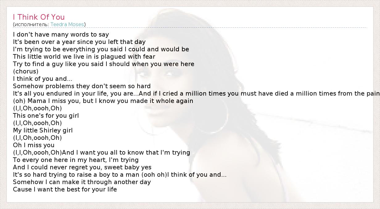 Это интересно:Teedra Moses (born December 17, 1976) is an American R&B and soul singer-songwriter.Moses was born and raised in New Orleans, Louisiana, to a gospel singing mother, Shirley Moses. She later moved to California with her mother and three siblings after her parents' separation. Moses brought a little bit of that fervor to her own vocal style when she began singing professionally. The final song on her debut album, "I Think of You (Shirley's Song)", is dedicated to her late mother.In 1996 she birthed twin sons Taj and Ras with rapper Ras Kass.Early lifeMoses was born and raised in New Orleans, Louisiana. Her childhood has been a direct influence on her... продолжение