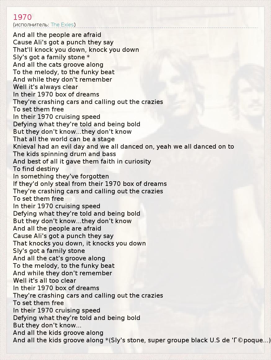 And all the people are afraid Cause Ali's got a punch they say That'll knock you down, knock you down Sly's got a family stone * And all the cats groove along To the melody, to the funky beat And while they don't remember Well it's always clear In their 1970 box of dreams They're crashing cars and calling out the crazies To set them free In their 1970 cruising speed Defying what they're told and being bold But they don't know...they don't know That all the world can be a stage Knieval had an evil day and we all danced on, yeah we all danced on to The kids spinning drum and bass And best of all it gave them faith in curiosity To find destiny In something they've forgotten If they'd only steal from their 1970 box of dreams They're crashing cars and calling out the crazies To set them free In their 1970 cruising speed Defying what they're told and being bold But they don't know...they don't know And all the people are afraid Cause Ali's got a punch they say That knocks you down, it knocks you down Sly's got a family stone And all the cat's groove along To the melody, to the funky beat And while they don't remember Well it's all too clear In their 1970 box of dreams They're crashing cars and calling out the crazies To set them free In their 1970 cruising speed Defying what they're told and being bold But they don't know... And all the kids groove along And all the kids groove along *(Sly's stone, super groupe black U.S de 'Г©poque...)