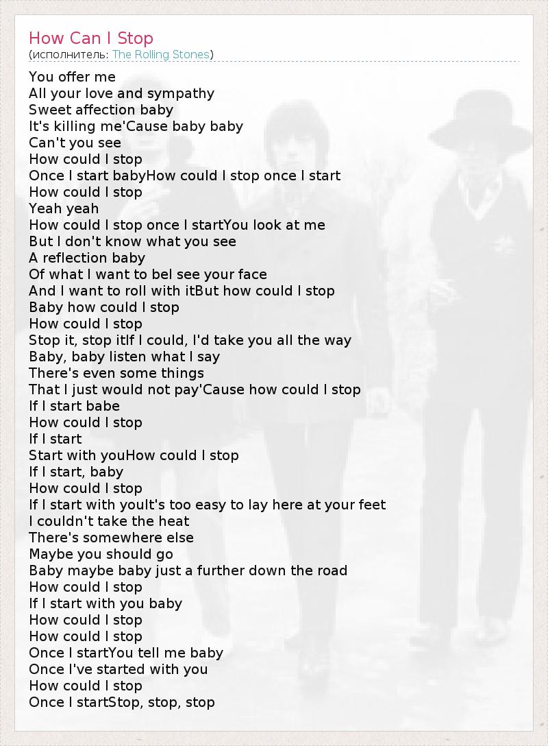 You offer me All your love and sympathy Sweet affection baby It's killing me'Cause baby baby Can't you see How could I stop Once I start babyHow could I stop once I start How could I stop Yeah yeah How could I stop once I startYou look at me But I don't know what you see A reflection baby Of what I want to beI see your face And I want to roll with itBut how could I stop Baby how could I stop How could I stop Stop it, stop itIf I could, I'd take you all the way Baby, baby listen what I say There's even some things That I just would not pay'Cause how could I stop If I start babe How could I stop If I start Start with youHow could I stop If I start, baby How could I stop If I start with youIt's too easy to lay here at your feet I couldn't take the heat There's somewhere else Maybe you should go Baby maybe baby just a further down the road How could I stop If I start with you baby How could I stop How could I stop Once I startYou tell me baby Once I've started with you How could I stop Once I startStop, stop, stop