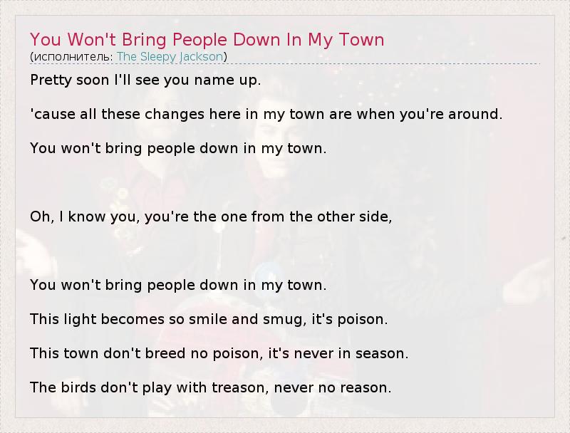 Pretty soon I'll see you name up. 'cause all these changes here in my town are when you're around. You won't bring people down in my town. Oh, I know you, you're the one from the other side, You won't bring people down in my town. This light becomes so smile and smug, it's poison. This town don't breed no poison, it's never in season. The birds don't play with treason, never no reason.