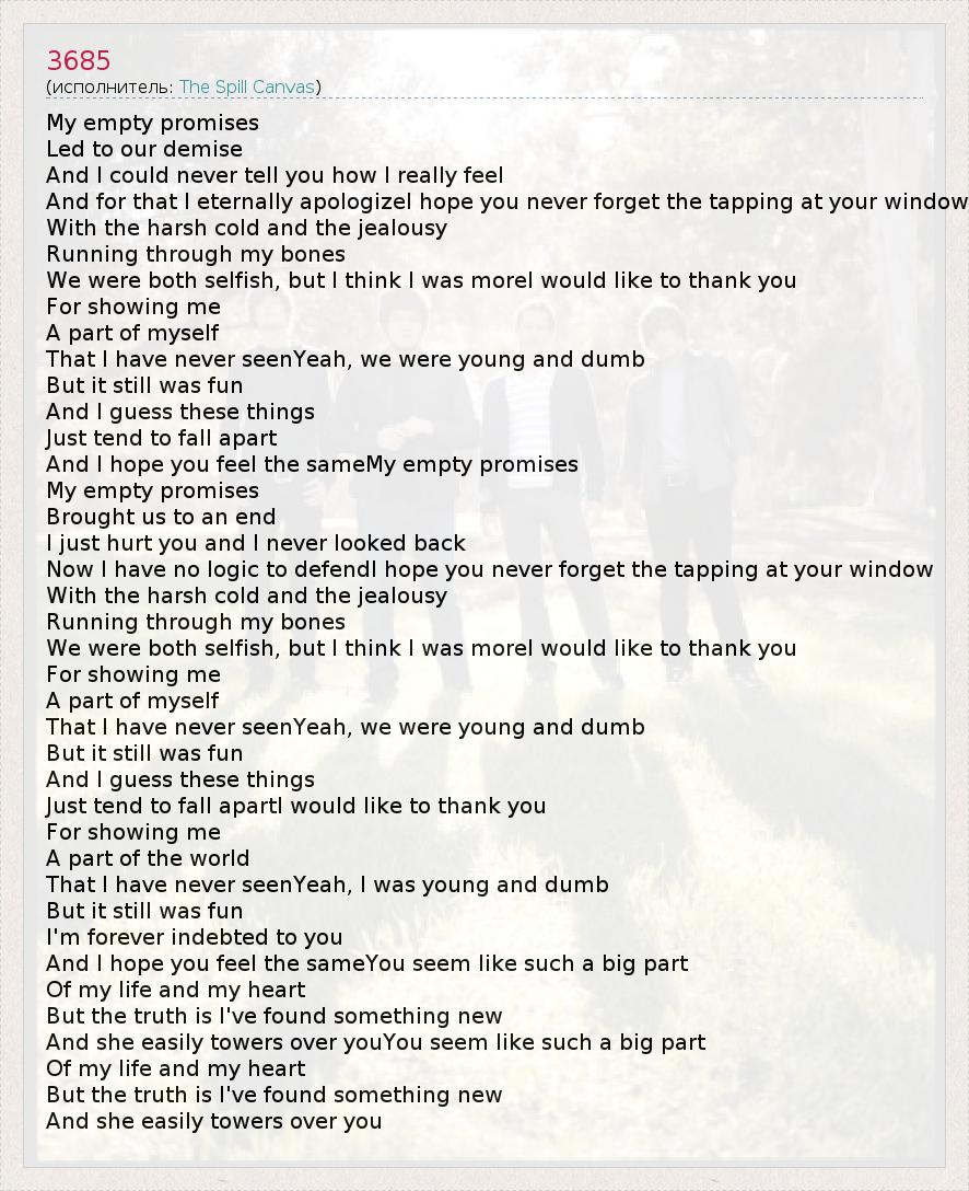 My empty promises Led to our demise And I could never tell you how I really feel And for that I eternally apologizeI hope you never forget the tapping at your window With the harsh cold and the jealousy Running through my bones We were both selfish, but I think I was moreI would like to thank you For showing me A part of myself That I have never seenYeah, we were young and dumb But it still was fun And I guess these things Just tend to fall apart And I hope you feel the sameMy empty promises My empty promises Brought us to an end I just hurt you and I never looked back Now I have no logic to defendI hope you never forget the tapping at your window With the harsh cold and the jealousy Running through my bones We were both selfish, but I think I was moreI would like to thank you For showing me A part of myself That I have never seenYeah, we were young and dumb But it still was fun And I guess these things Just tend to fall apartI would like to thank you For showing me A part of the world That I have never seenYeah, I was young and dumb But it still was fun I'm forever indebted to you And I hope you feel the sameYou seem like such a big part Of my life and my heart But the truth is I've found something new And she easily towers over youYou seem like such a big part Of my life and my heart But the truth is I've found something new And she easily towers over you