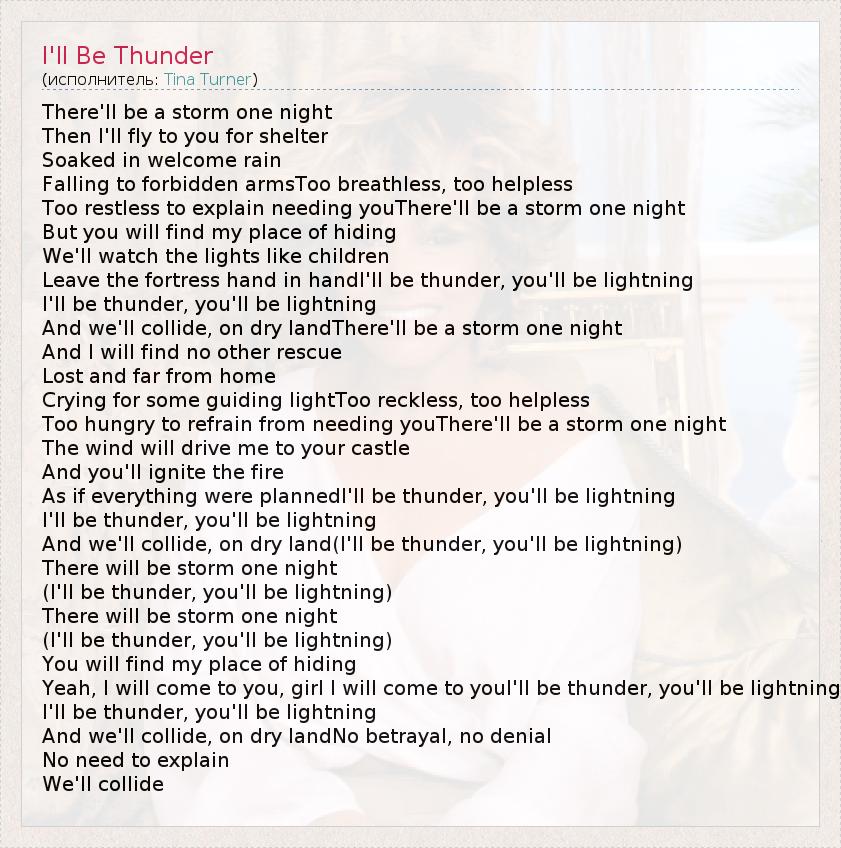 There'll be a storm one night Then I'll fly to you for shelter Soaked in welcome rain Falling to forbidden armsToo breathless, too helpless Too restless to explain needing youThere'll be a storm one night But you will find my place of hiding We'll watch the lights like children Leave the fortress hand in handI'll be thunder, you'll be lightning I'll be thunder, you'll be lightning And we'll collide, on dry landThere'll be a storm one night And I will find no other rescue Lost and far from home Crying for some guiding lightToo reckless, too helpless Too hungry to refrain from needing youThere'll be a storm one night The wind will drive me to your castle And you'll ignite the fire As if everything were plannedI'll be thunder, you'll be lightning I'll be thunder, you'll be lightning And we'll collide, on dry land(I'll be thunder, you'll be lightning) There will be storm one night (I'll be thunder, you'll be lightning) There will be storm one night (I'll be thunder, you'll be lightning) You will find my place of hiding Yeah, I will come to you, girl I will come to youI'll be thunder, you'll be lightning I'll be thunder, you'll be lightning And we'll collide, on dry landNo betrayal, no denial No need to explain We'll collide