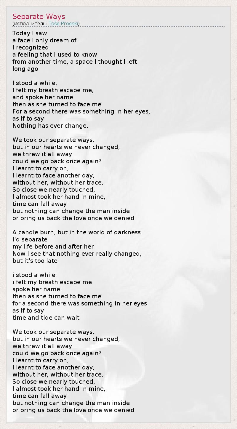 Today I saw a face I only dream of I recognized a feeling that I used to know from another time, a space I thought I left long ago I stood a while, I felt my breath escape me, and spoke her name then as she turned to face me For a second there was something in her eyes, as if to say Nothing has ever change. We took our separate ways, but in our hearts we never changed, we threw it all away could we go back once again? I learnt to carry on, I learnt to face another day, without her, without her trace. So close we nearly touched, I almost took her hand in mine, time can fall away but nothing can change the man inside or bring us back the love once we denied A candle burn, but in the world of darkness I'd separate my life before and after her Now I see that nothing ever really changed, but it's too late i stood a while i felt my breath escape me spoke her name then as she turned to face me for a second there was something in her eyes as if to say time and tide can wait We took our separate ways, but in our hearts we never changed, we threw it all away could we go back once again? I learnt to carry on, I learnt to face another day, without her, without her trace. So close we nearly touched, I almost took her hand in mine, time can fall away but nothing can change the man inside or bring us back the love once we denied