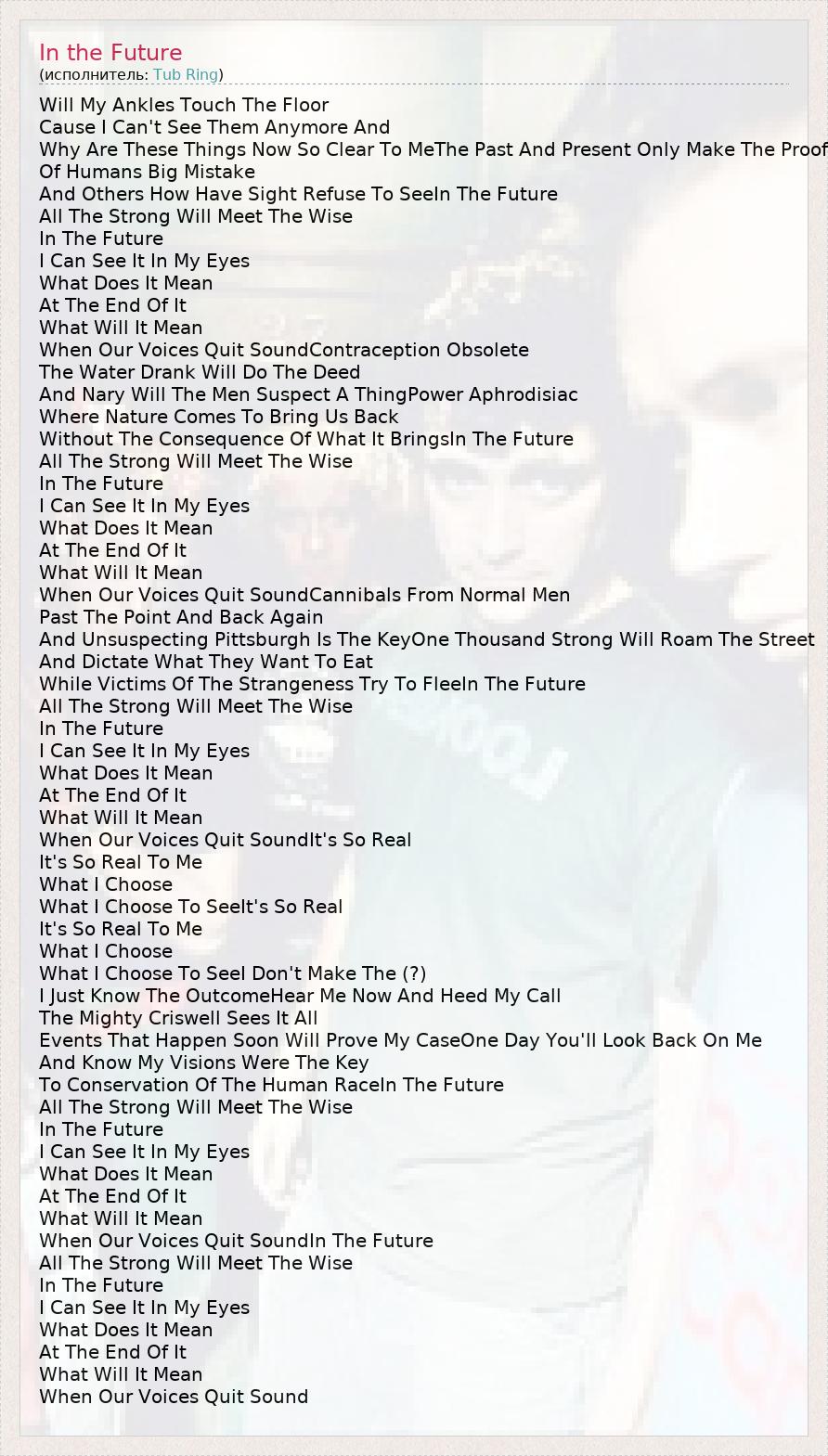 Will My Ankles Touch The Floor Cause I Can't See Them Anymore And Why Are These Things Now So Clear To MeThe Past And Present Only Make The Proof Of Humans Big Mistake And Others How Have Sight Refuse To SeeIn The Future All The Strong Will Meet The Wise In The Future I Can See It In My Eyes What Does It Mean At The End Of It What Will It Mean When Our Voices Quit SoundContraception Obsolete The Water Drank Will Do The Deed And Nary Will The Men Suspect A ThingPower Aphrodisiac Where Nature Comes To Bring Us Back Without The Consequence Of What It BringsIn The Future All The Strong Will Meet The Wise In The Future I Can See It In My Eyes What Does It Mean At The End Of It What Will It Mean When Our Voices Quit SoundCannibals From Normal Men Past The Point And Back Again And Unsuspecting Pittsburgh Is The KeyOne Thousand Strong Will Roam The Street And Dictate What They Want To Eat While Victims Of The Strangeness Try To FleeIn The Future All The Strong Will Meet The Wise In The Future I Can See It In My Eyes What Does It Mean At The End Of It What Will It Mean When Our Voices Quit SoundIt's So Real It's So Real To Me What I Choose What I Choose To SeeIt's So Real It's So Real To Me What I Choose What I Choose To SeeI Don't Make The (?) I Just Know The OutcomeHear Me Now And Heed My Call The Mighty Criswell Sees It All Events That Happen Soon Will Prove My CaseOne Day You'll Look Back On Me And Know My Visions Were The Key To Conservation Of The Human RaceIn The Future All The Strong Will Meet The Wise In The Future I Can See It In My Eyes What Does It Mean At The End Of It What Will It Mean When Our Voices Quit SoundIn The Future All The Strong Will Meet The Wise In The Future I Can See It In My Eyes What Does It Mean At The End Of It What Will It Mean When Our Voices Quit Sound