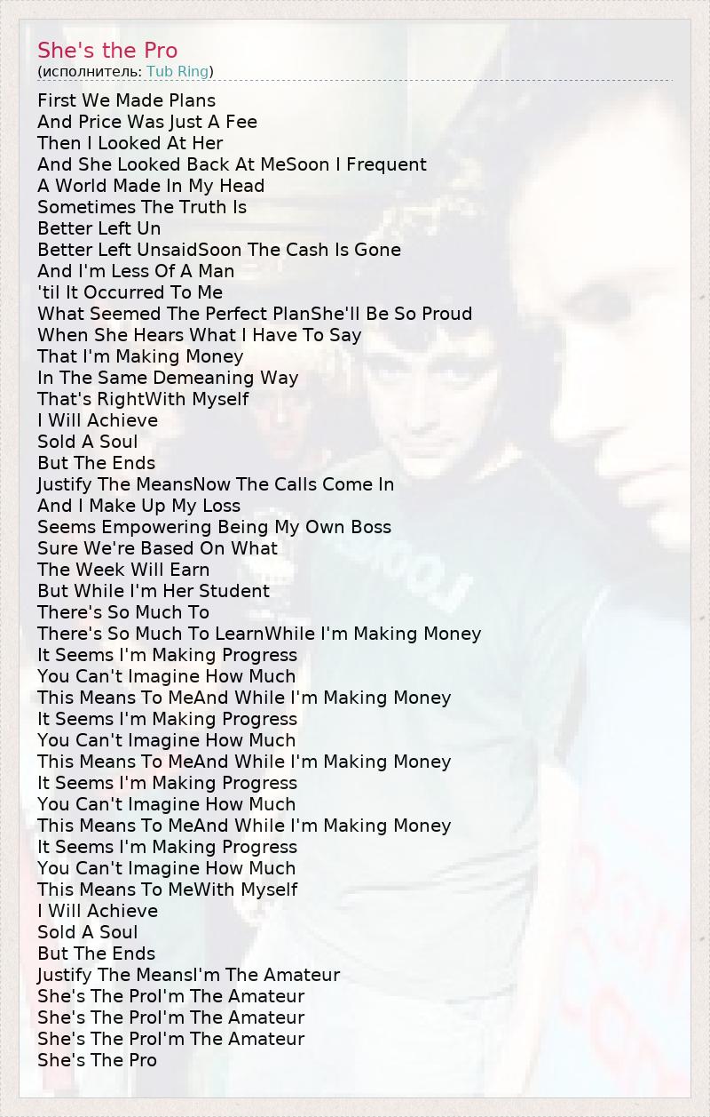 First We Made Plans And Price Was Just A Fee Then I Looked At Her And She Looked Back At MeSoon I Frequent A World Made In My Head Sometimes The Truth Is Better Left Un Better Left UnsaidSoon The Cash Is Gone And I'm Less Of A Man 'til It Occurred To Me What Seemed The Perfect PlanShe'll Be So Proud When She Hears What I Have To Say That I'm Making Money In The Same Demeaning Way That's RightWith Myself I Will Achieve Sold A Soul But The Ends Justify The MeansNow The Calls Come In And I Make Up My Loss Seems Empowering Being My Own Boss Sure We're Based On What The Week Will Earn But While I'm Her Student There's So Much To There's So Much To LearnWhile I'm Making Money It Seems I'm Making Progress You Can't Imagine How Much This Means To MeAnd While I'm Making Money It Seems I'm Making Progress You Can't Imagine How Much This Means To MeAnd While I'm Making Money It Seems I'm Making Progress You Can't Imagine How Much This Means To MeAnd While I'm Making Money It Seems I'm Making Progress You Can't Imagine How Much This Means To MeWith Myself I Will Achieve Sold A Soul But The Ends Justify The MeansI'm The Amateur She's The ProI'm The Amateur She's The ProI'm The Amateur She's The ProI'm The Amateur She's The Pro