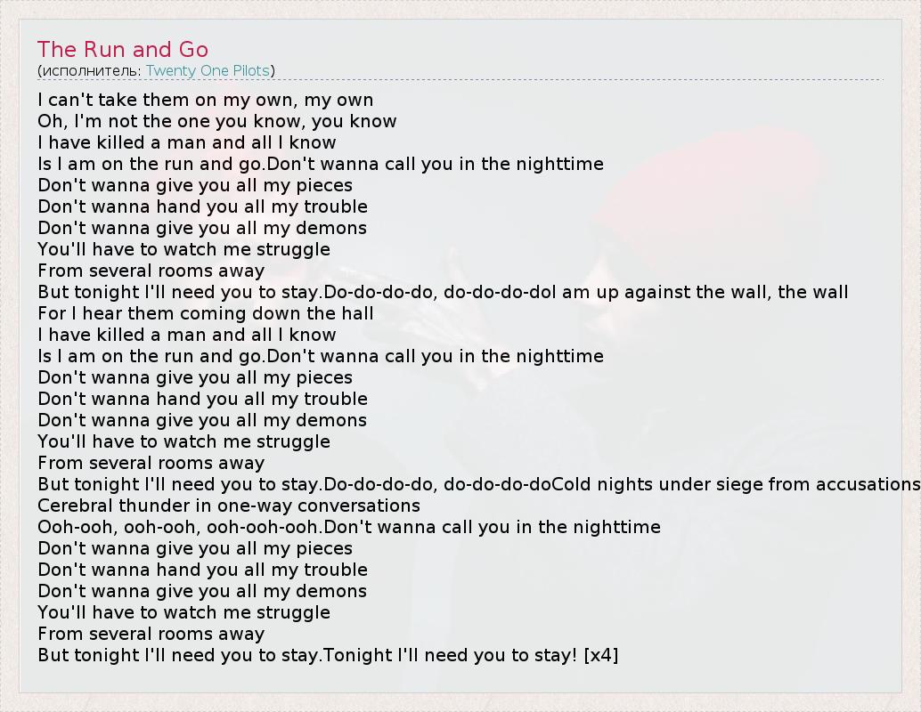 I can't take them on my own, my own Oh, I'm not the one you know, you know I have killed a man and all I know Is I am on the run and go.Don't wanna call you in the nighttime Don't wanna give you all my pieces Don't wanna hand you all my trouble Don't wanna give you all my demons You'll have to watch me struggle From several rooms away But tonight I'll need you to stay.Do-do-do-do, do-do-do-doI am up against the wall, the wall For I hear them coming down the hall I have killed a man and all I know Is I am on the run and go.Don't wanna call you in the nighttime Don't wanna give you all my pieces Don't wanna hand you all my trouble Don't wanna give you all my demons You'll have to watch me struggle From several rooms away But tonight I'll need you to stay.Do-do-do-do, do-do-do-doCold nights under siege from accusations Cerebral thunder in one-way conversations Ooh-ooh, ooh-ooh, ooh-ooh-ooh.Don't wanna call you in the nighttime Don't wanna give you all my pieces Don't wanna hand you all my trouble Don't wanna give you all my demons You'll have to watch me struggle From several rooms away But tonight I'll need you to stay.Tonight I'll need you to stay! [x4]