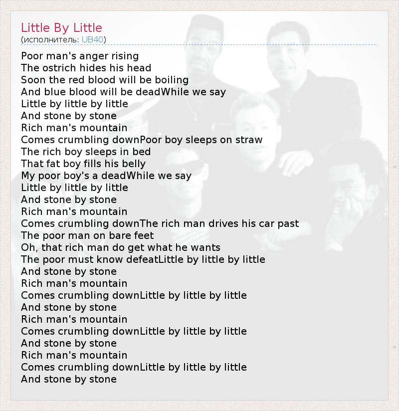 Poor man's anger rising The ostrich hides his head Soon the red blood will be boiling And blue blood will be deadWhile we say Little by little by little And stone by stone Rich man's mountain Comes crumbling downPoor boy sleeps on straw The rich boy sleeps in bed That fat boy fills his belly My poor boy's a deadWhile we say Little by little by little And stone by stone Rich man's mountain Comes crumbling downThe rich man drives his car past The poor man on bare feet Oh, that rich man do get what he wants The poor must know defeatLittle by little by little And stone by stone Rich man's mountain Comes crumbling downLittle by little by little And stone by stone Rich man's mountain Comes crumbling downLittle by little by little And stone by stone Rich man's mountain Comes crumbling downLittle by little by little And stone by stone