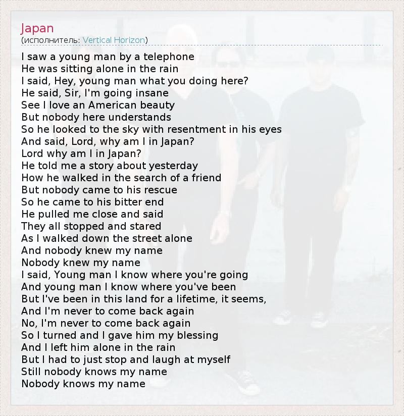 I saw a young man by a telephone He was sitting alone in the rain I said, Hey, young man what you doing here? He said, Sir, I'm going insane See I love an American beauty But nobody here understands So he looked to the sky with resentment in his eyes And said, Lord, why am I in Japan? Lord why am I in Japan? He told me a story about yesterday How he walked in the search of a friend But nobody came to his rescue So he came to his bitter end He pulled me close and said They all stopped and stared As I walked down the street alone And nobody knew my name Nobody knew my name I said, Young man I know where you're going And young man I know where you've been But I've been in this land for a lifetime, it seems, And I'm never to come back again No, I'm never to come back again So I turned and I gave him my blessing And I left him alone in the rain But I had to just stop and laugh at myself Still nobody knows my name Nobody knows my name