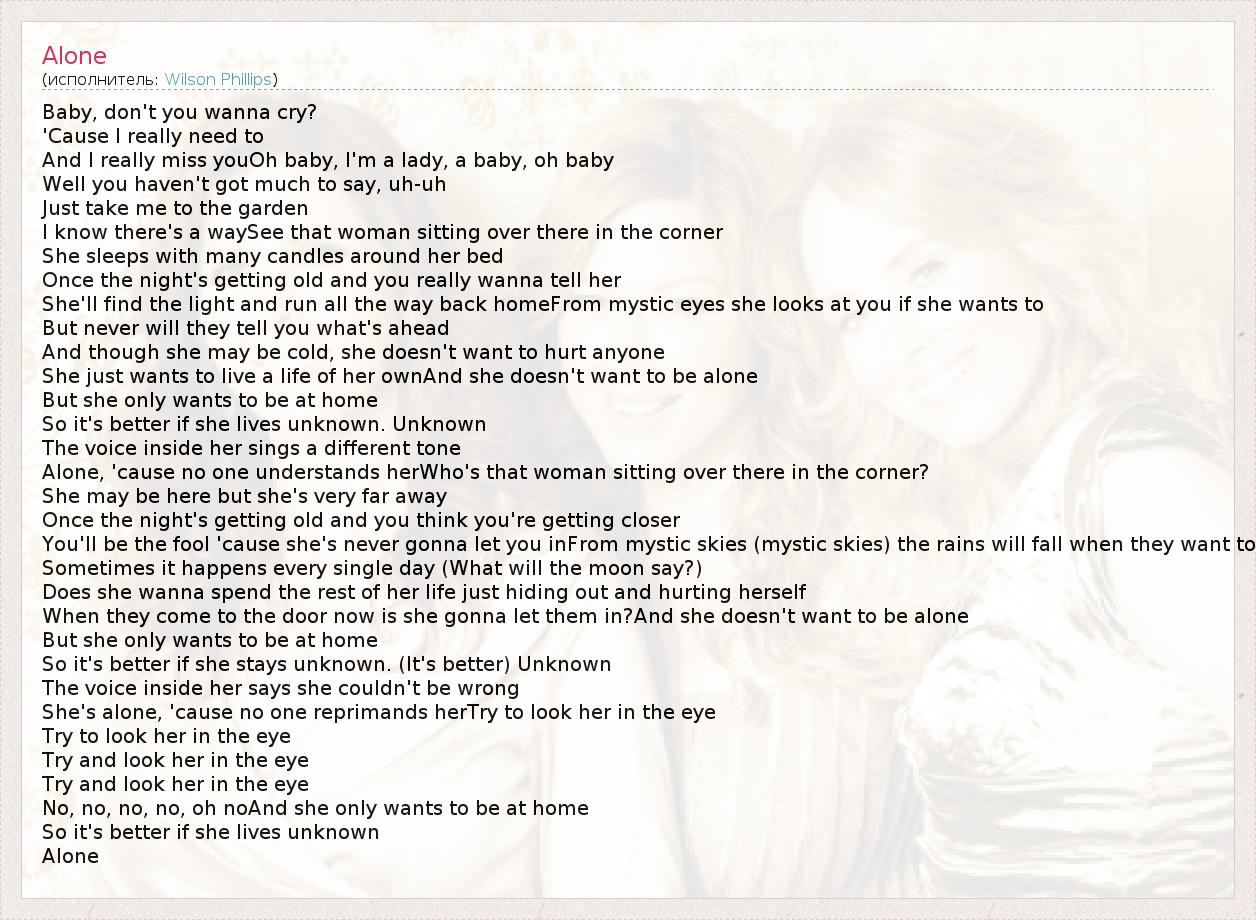 Baby, don't you wanna cry? 'Cause I really need to And I really miss youOh baby, I'm a lady, a baby, oh baby Well you haven't got much to say, uh-uh Just take me to the garden I know there's a waySee that woman sitting over there in the corner She sleeps with many candles around her bed Once the night's getting old and you really wanna tell her She'll find the light and run all the way back homeFrom mystic eyes she looks at you if she wants to But never will they tell you what's ahead And though she may be cold, she doesn't want to hurt anyone She just wants to live a life of her ownAnd she doesn't want to be alone But she only wants to be at home So it's better if she lives unknown. Unknown The voice inside her sings a different tone Alone, 'cause no one understands herWho's that woman sitting over there in the corner? She may be here but she's very far away Once the night's getting old and you think you're getting closer You'll be the fool 'cause she's never gonna let you inFrom mystic skies (mystic skies) the rains will fall when they want to Sometimes it happens every single day (What will the moon say?) Does she wanna spend the rest of her life just hiding out and hurting herself When they come to the door now is she gonna let them in?And she doesn't want to be alone But she only wants to be at home So it's better if she stays unknown. (It's better) Unknown The voice inside her says she couldn't be wrong She's alone, 'cause no one reprimands herTry to look her in the eye Try to look her in the eye Try and look her in the eye Try and look her in the eye No, no, no, no, oh noAnd she only wants to be at home So it's better if she lives unknown Alone