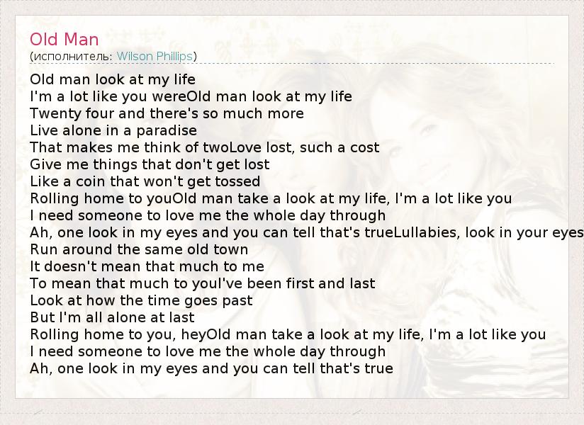 Old man look at my life I'm a lot like you wereOld man look at my life Twenty four and there's so much more Live alone in a paradise That makes me think of twoLove lost, such a cost Give me things that don't get lost Like a coin that won't get tossed Rolling home to youOld man take a look at my life, I'm a lot like you I need someone to love me the whole day through Ah, one look in my eyes and you can tell that's trueLullabies, look in your eyes Run around the same old town It doesn't mean that much to me To mean that much to youI've been first and last Look at how the time goes past But I'm all alone at last Rolling home to you, heyOld man take a look at my life, I'm a lot like you I need someone to love me the whole day through Ah, one look in my eyes and you can tell that's true