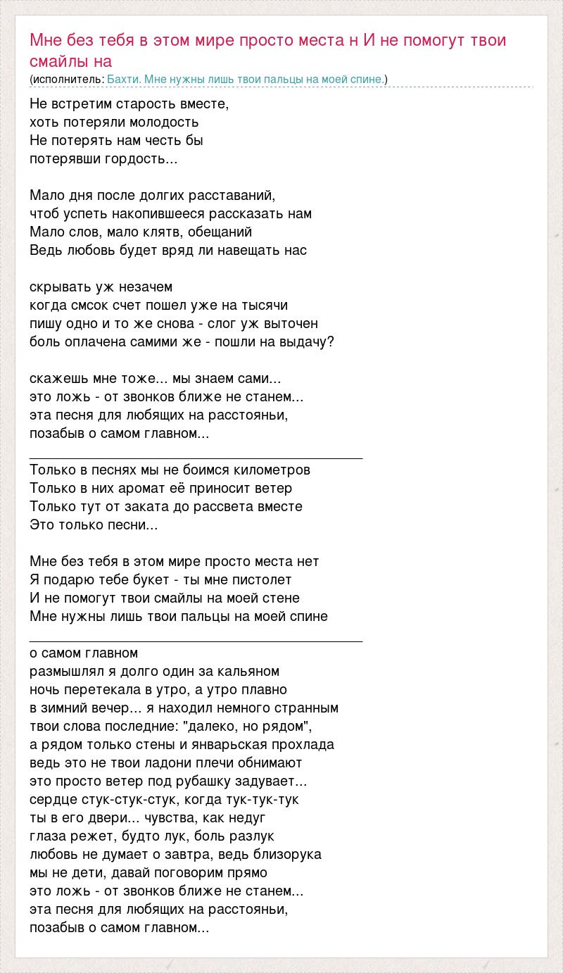 Главная→Исполнители→Бахти. Мне нужны лишь твои пальцы на моей спине.→Мне без тебя в этом мире просто места н И не помогут твои смайлы на